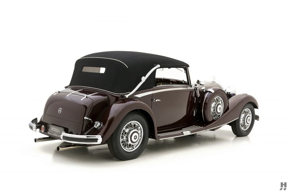 130.885 : 1936, 500 K, Cabriolet C, grilles de capot dans le style 540, double pare-chocs avec éléments en caoutchouc, baguettes chromées dans le bas des ailes, couvre roues de secours peints, Noire, cuir rouge.