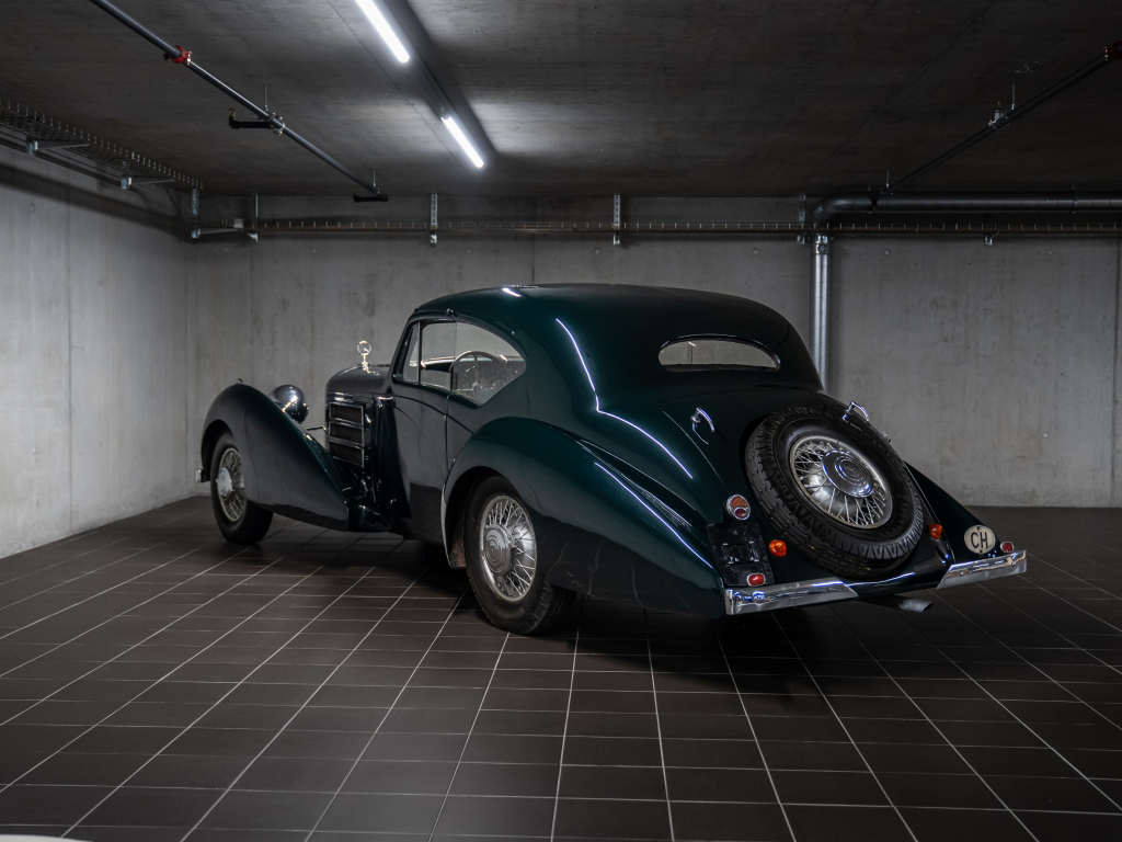 123.683 : 1935, 500 K, Cabriolet 2 places par H.J. Mulliner spats démontables, 2 roues de secours sur le coffre, espace de rangement pour bagages derrière les sièges arrières, tableau de bord noyer.