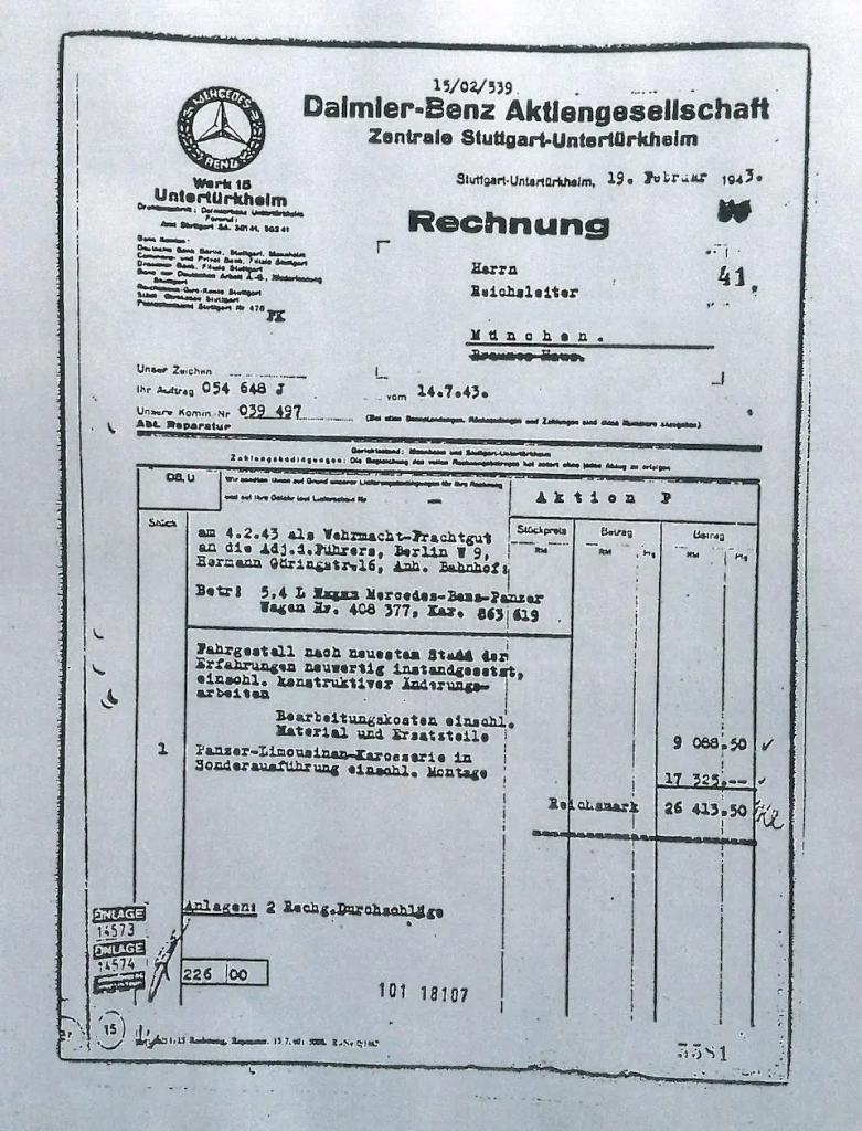 1942 : Réquisitionnée par la Chancellerie du Reich, Berlin (D) pour son programme de 20 Aktion P (Panzer) VIP de voitures blindées destinées à véhiculer les hauts dignitaires nazis.