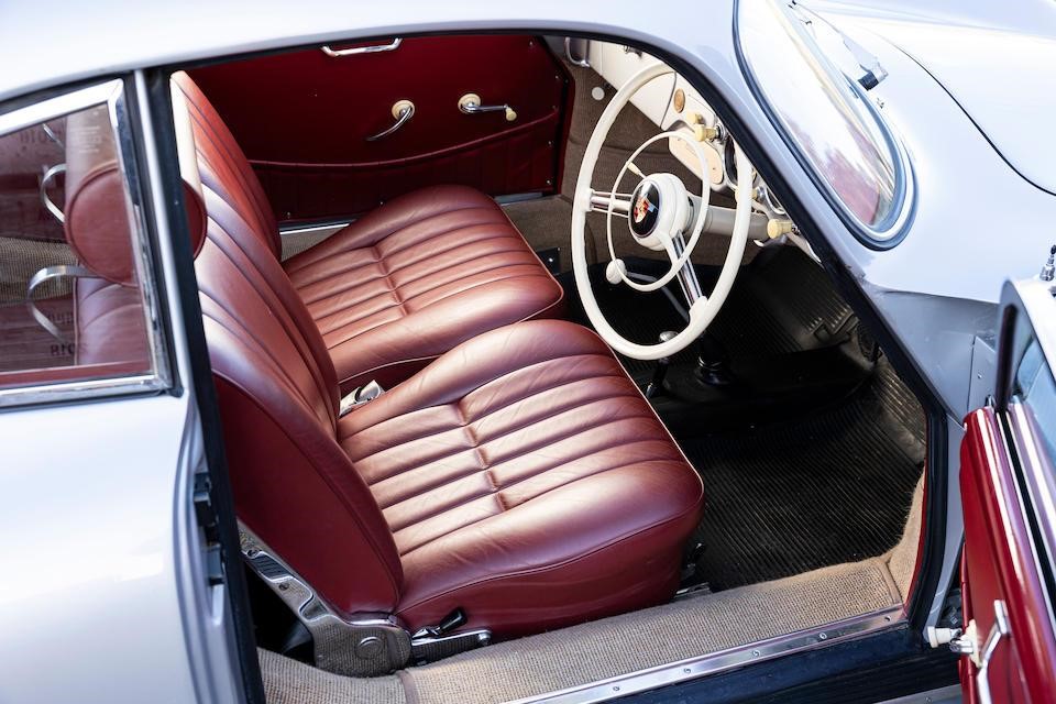 58355 : 1957, 356A Carrera 1500 GS Coupé, CAD, phares antibrouillard, toit coulissant, 2 appuie-têtes, Gris métallisé, cuir rouge.