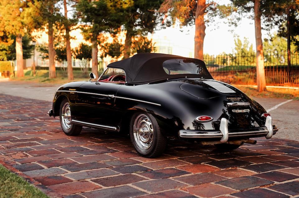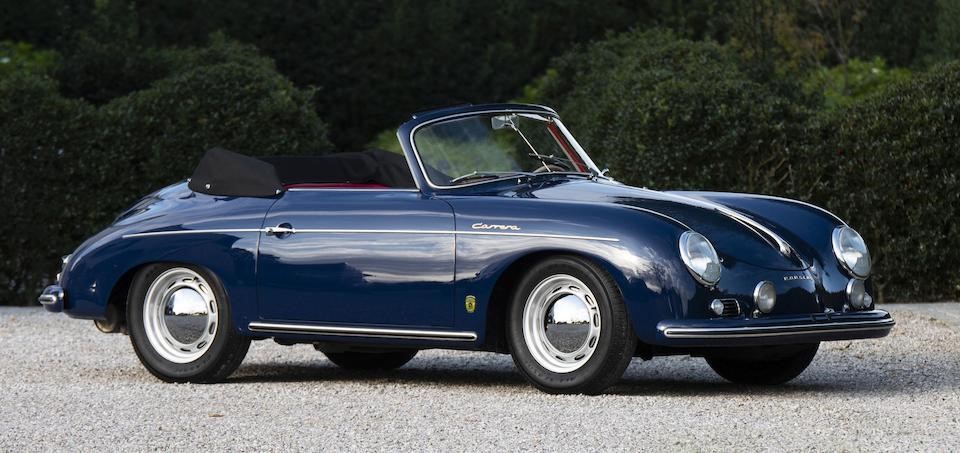 61163 : 1956, 356A 1500 GS Carrera Cabriolet T1, moteur P90617, jantes chromées, phares antibrouillard, moulures latérales de Speedster, radio Blaupunkt Köln avec antenne, siège Speedster, Azurblau, intérieur Acella Blast.