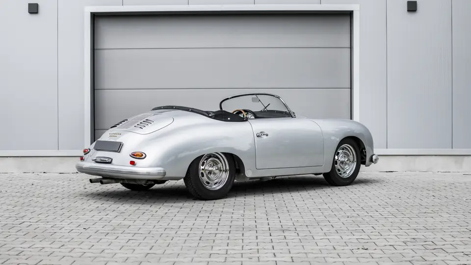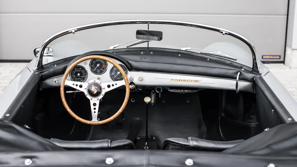 84939 : 1959, 356A 1600 GS/GT Carrera Speedster, moteur 692/3 n°95031, pneus Continental Super Record, rétroviseur, arceau, volant VDM, Argent métallisé, intérieur noir.
