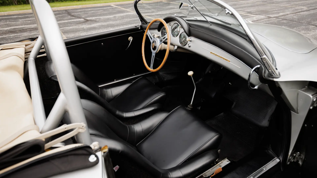 83622 : 23/07/1957, 356 A Carrera GT Speedster par Reutter, moteur 90858, boîte de vitesses 15632, Argent métallisé, simili noir, sièges baquet sport à armatures aluminium simili noir et tissu beige.