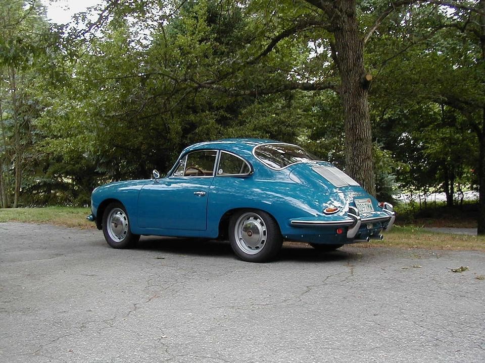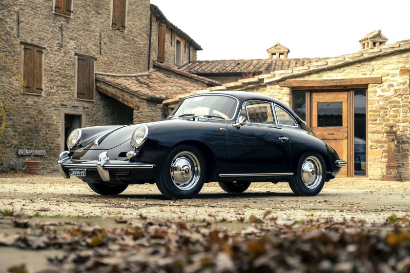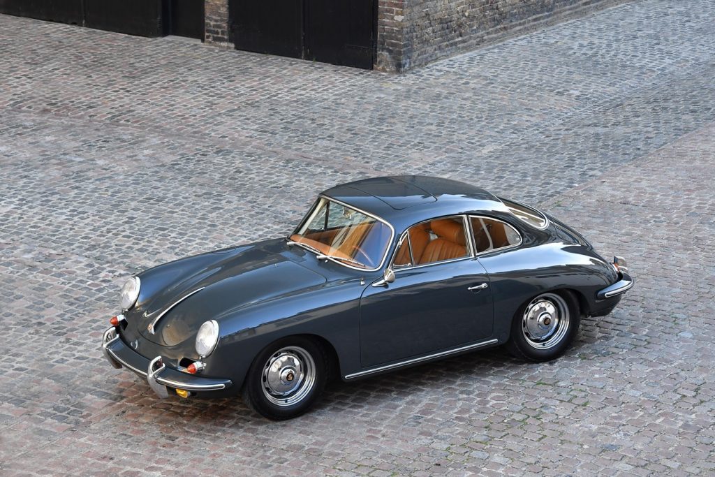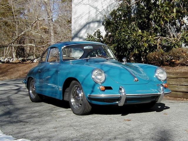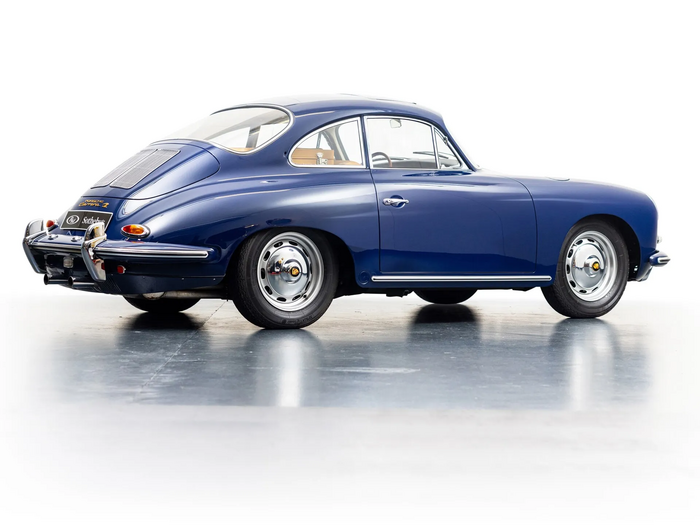 121.298 : 1963, 356 C Carrera 2 2000 GS Coupé, moteur 97091, boîte de vitesses 57498, toit ouvrant, jantes à enjoliveurs chromés, radio AM/FM avec 2 haut-parleurs, antenne électrique, siège conducteur abaissé, Oslo Blau (6203), simili et tissu brun clair.