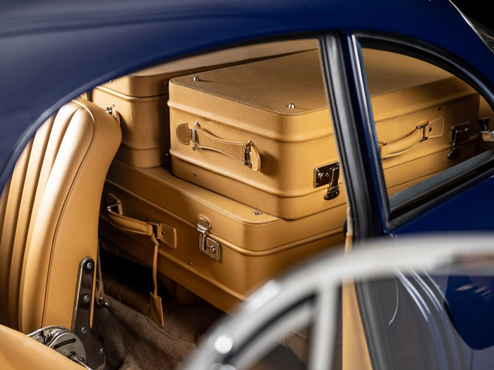 Reçoit moteur 97195, jantes à voiles chromés, feux de route supplémentaires, montre VDO, volant cerclé bois, appuie-têtes, radio Blaupunkt Frankfurt.