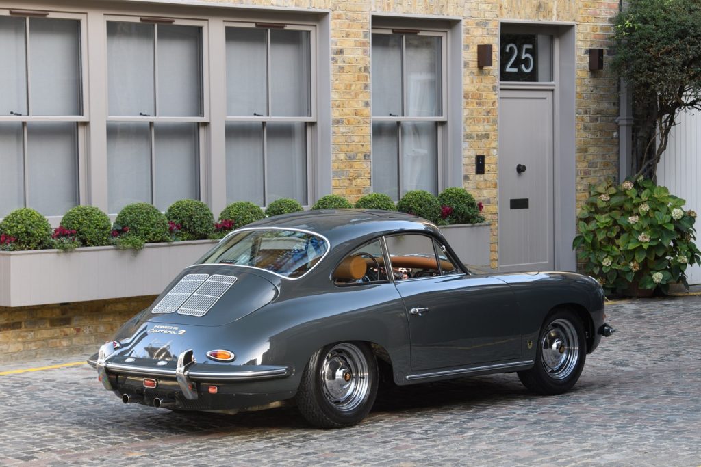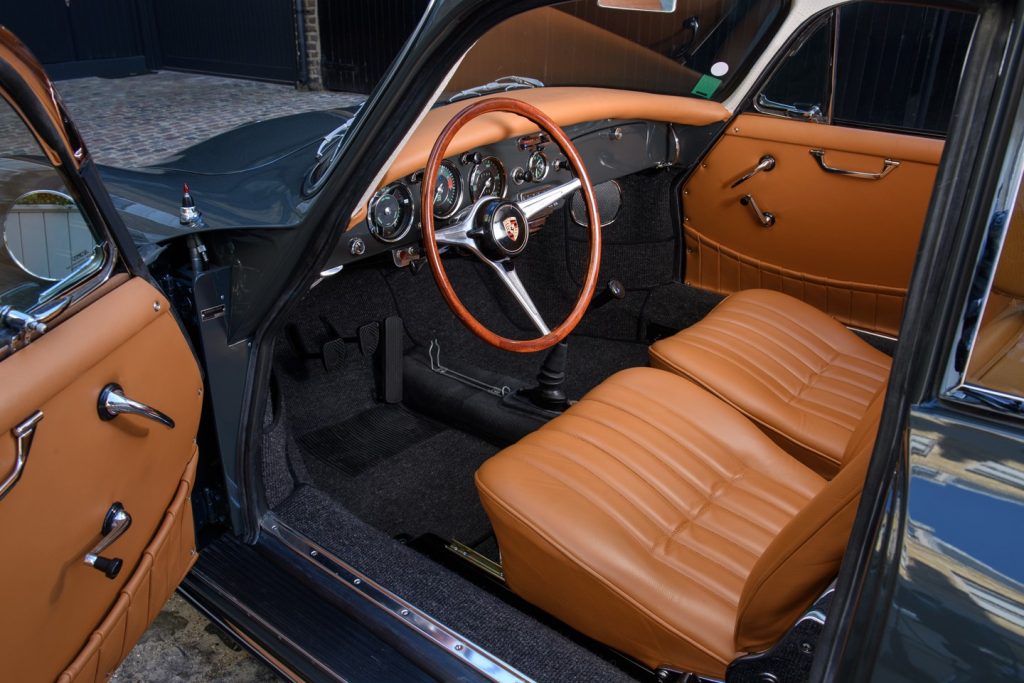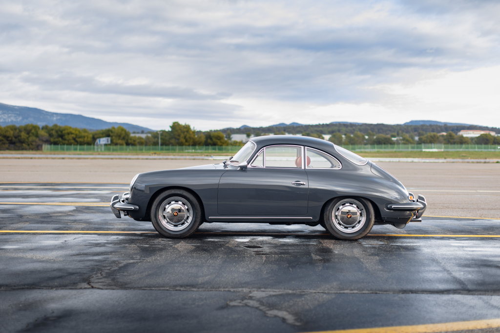 158.478 : 1963, 356C Carrera 2 Cabriolet par Reutter, freins à disques annulaires, enjoliveurs chromés ajourés, pneus Dunlop 15″, réservoir 70 l, rétroviseur extérieur chromé Spyder GT, insonorisation simplifiée, thermomètre intérieur et extérieur, boussole, 2 haut-parleurs, 2 accoudoirs, appuie-têtes, rétroviseur intérieur, antenne repliable, Gris Héron (6207B), cuir noir.