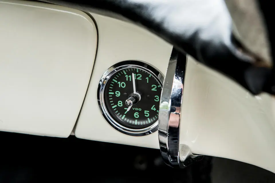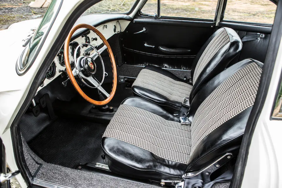 123.845 : 04/1963, 356B Carrera 2 2000 GS, toit ouvrant, 2 phares longue portée, chauffage gaz et électricité Eberspacher, ceintures de sécurité 3 points, thermomètre, montre sur la boîte à gants, radio multibandes Blaupunkt avec antenne et haut-parleur, Ivoire, simili noir et drap Pepita.