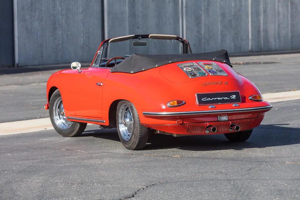 158.183 : 04/1963, 356B Carrera 2 GS Cabriolet par Reutter, moteur 97243, Signal Rot, cuir noir, capote noire.