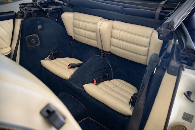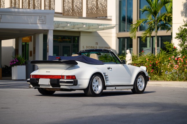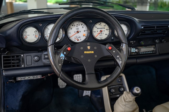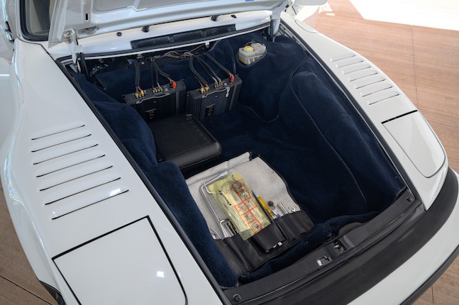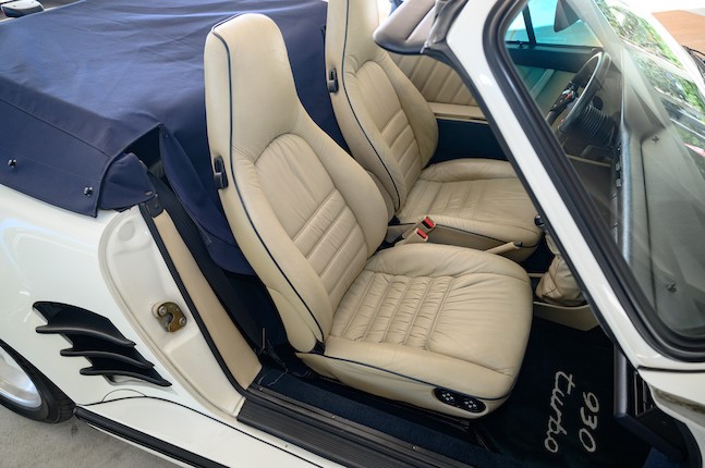WPOEB0939JS070180 : 10/1987, Turbo 3,3 litres Cabriolet Flachbau, 1/28, moteur 68J00482, différentiel autobloquant, jantes Grand Prix Weiss, alarme, compartiment bagages garni de velours, radio Blaupunkt Reno, capote à commande électrique, Grand Prix Weiss, cuir Linen à passepoils marine, tapis de sol et capote marine.
