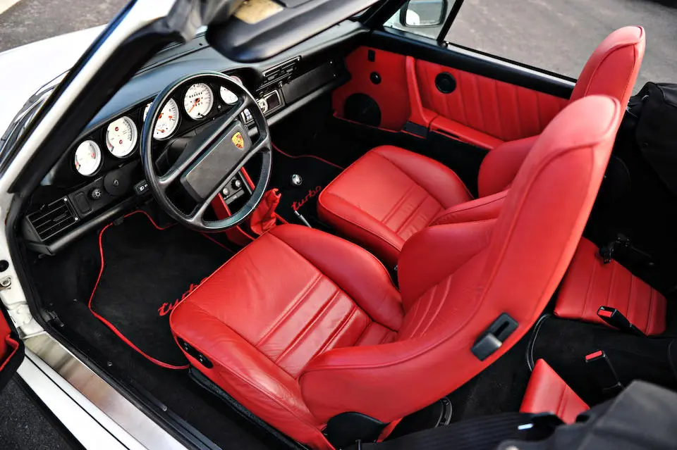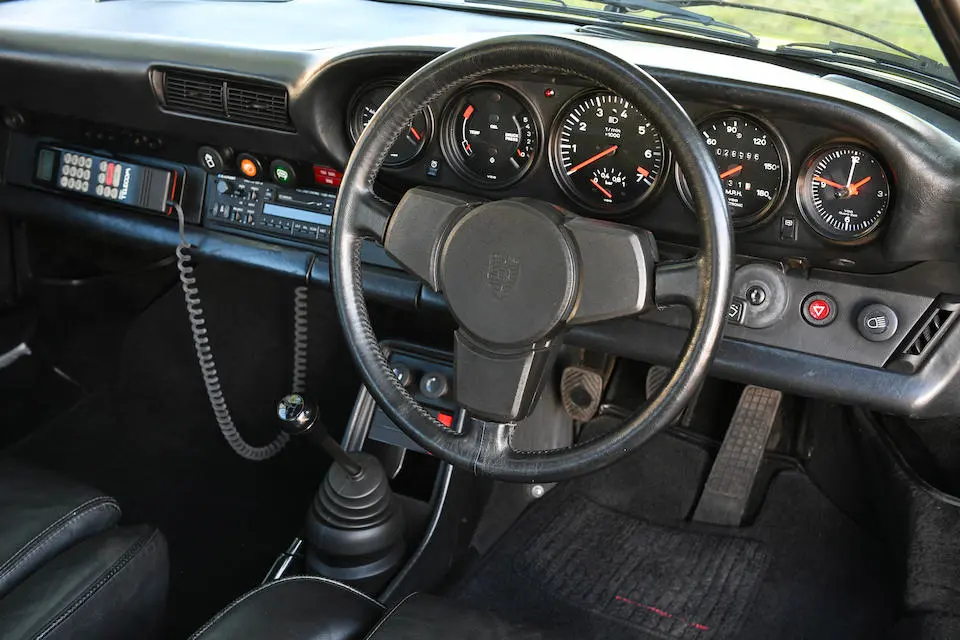 WPOZZZ93ZKS000174 : 1980, Turbo 3,3 litres, moteur 67K00203, boîte de vitesses à 5 rapports, différentiel autobloquant, jantes Fuchs, toit ouvrant électrique, sièges électriques, intérieur tout cuir, climatisation, pare-brise teinté, levier de vitesses à débattement court, Rouge indien, cuir beige.