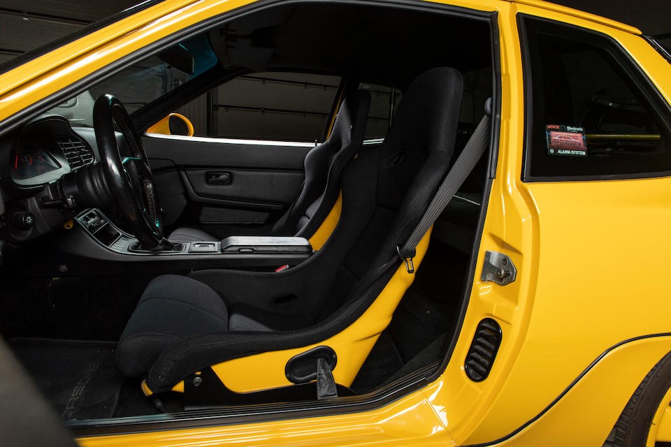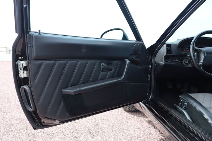Ailes élargies, freins avant de la 928 S4. Jantes en alliage léger Club Sport Fuchs en aluminium forgé 7×16/9×16″, pneus 225-50×16/245-45×16. Sièges conducteur et passager à réglage électrique.