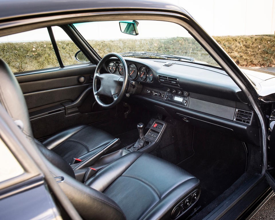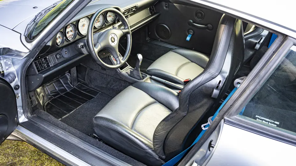 Intérieur en grande partie conservé. Compteurs et boutons avec inscriptions blanches (couleur sur les 964) sauf les feux de détresse rouges. Nouveau volant à 4 branches intégrant un airbag. Sièges et panneaux de porte redessinés. Compartiment bagages avant (123 l) garni de moquette.