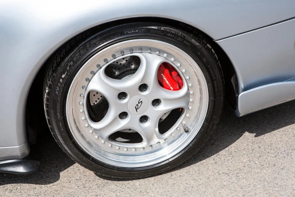 Les freins sont repris de la 993 Turbo avec étriers peints en rouge et système antiblocage. Jantes en magnésium de 18 pouces BBS à fixation centrale.