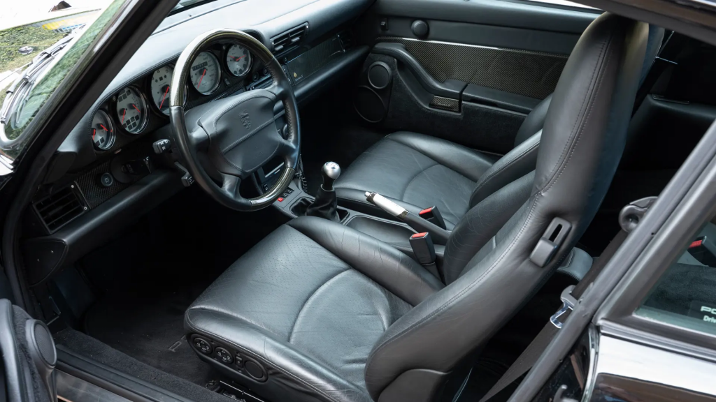 WP0AC2992VS375828 : 03/1997, Turbo S, siège conducteur à support lombaire, chargeur CD 6 disques, tapis de sol avec logo Porsche, tablette cuir derrière le frein à main, volant cuir et fibre de carbone, Noire, cuir noir.