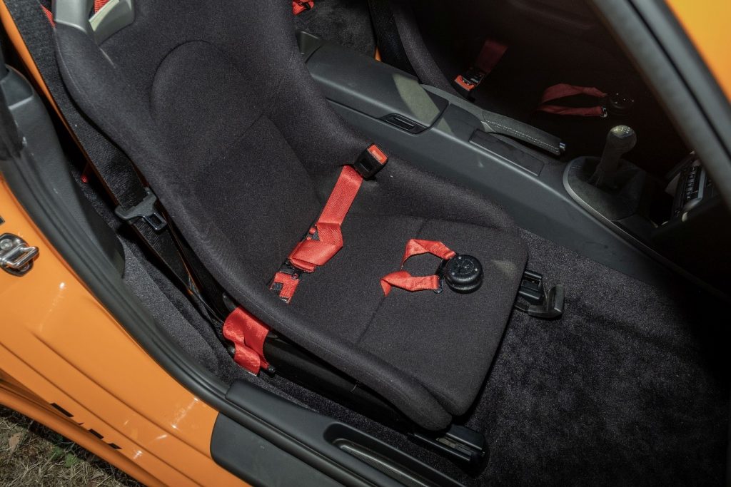 Sièges baquets allégés, arceau de sécurité et harnais 6 points, jantes 19 pouces à 5 goujons, prise d’air supplémentaire à l’avant.