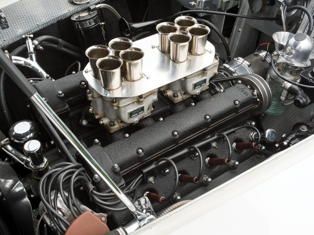 3178 cm3 (85×70), taux de compression : 8,5 :1, 223 chevaux à 6000 tours, 27,65 Mkg à 4500 tours, 4 carburateurs double corps Weber 36 DCF1, 2 pompes à essence.