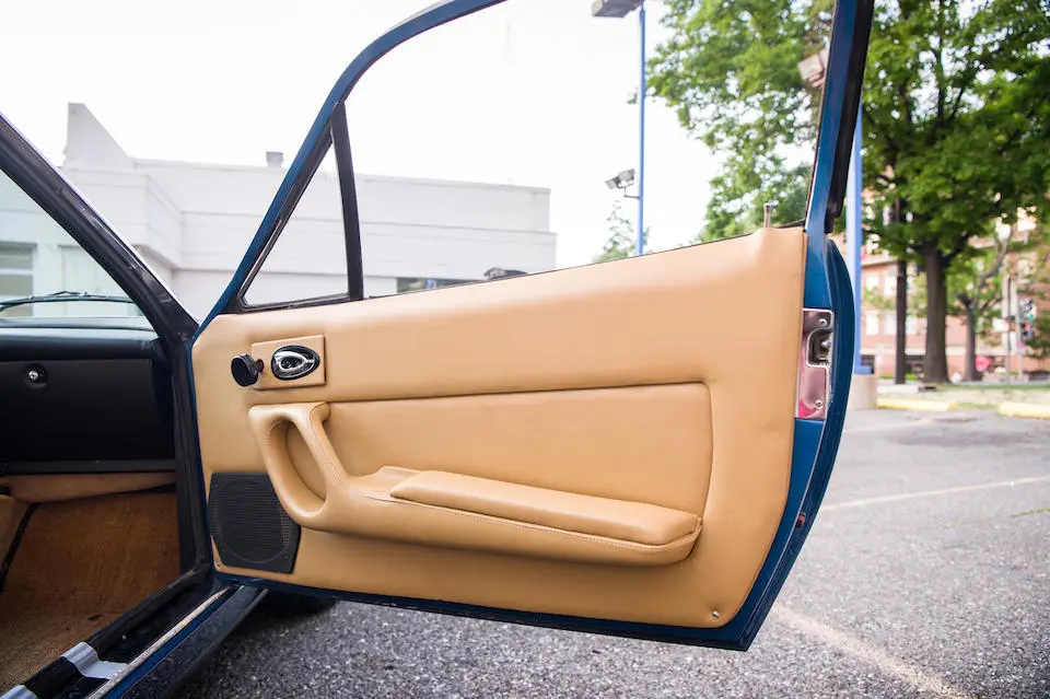 16289 : 1973, caisse 492, antibrouillards, Blu Ribot, cuir beige.