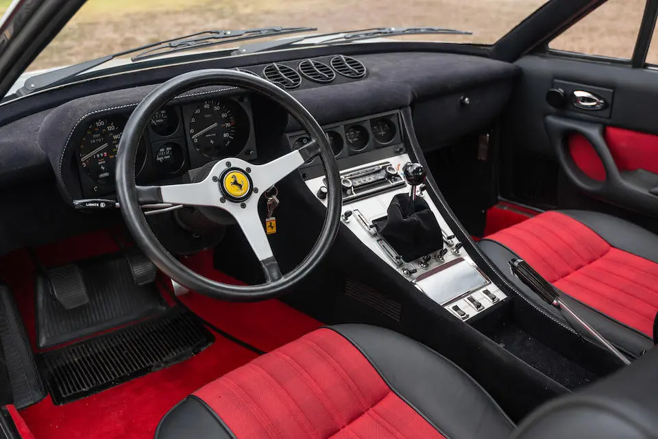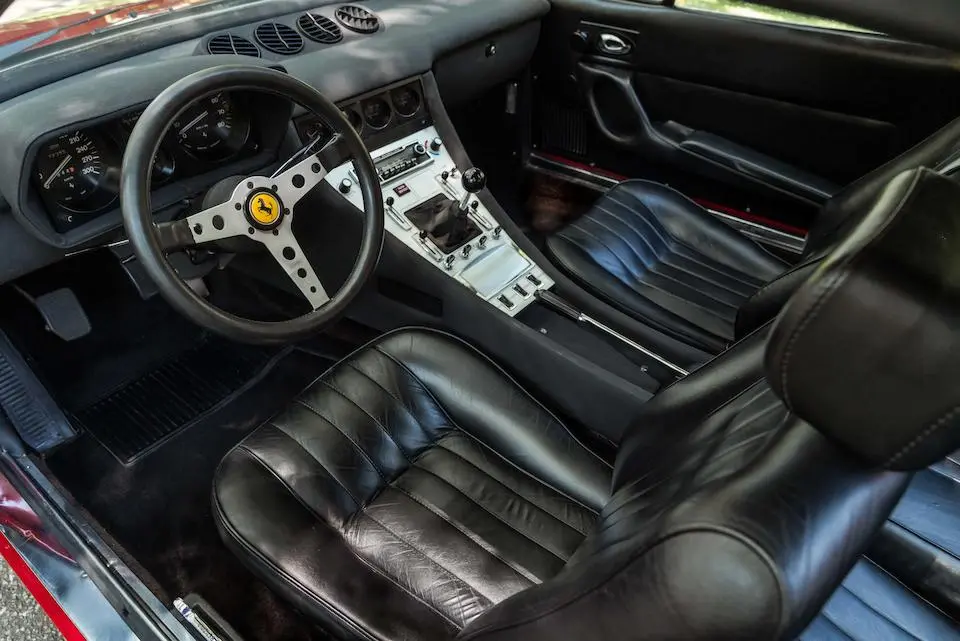15359 : 1972, jantes à rayons Borrani, Rosso Corsa, cuir noir.