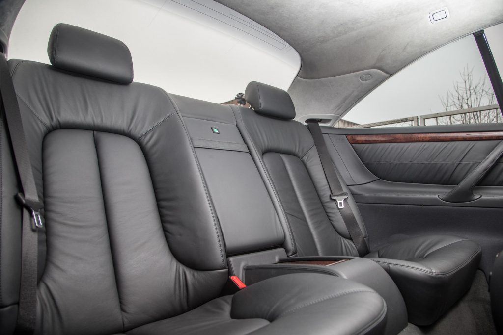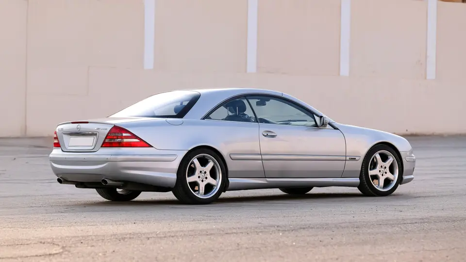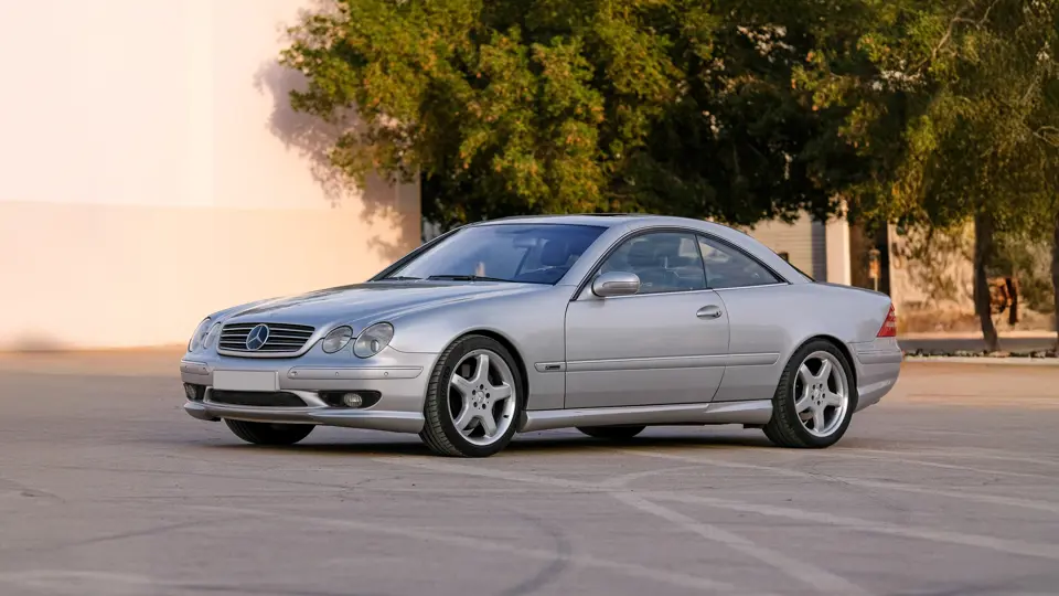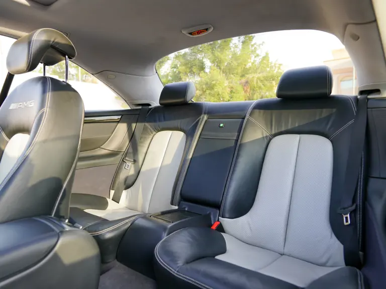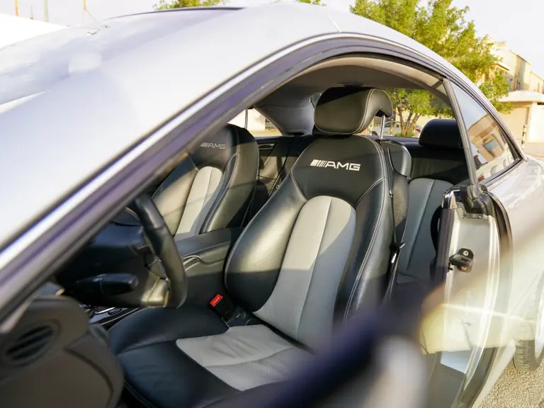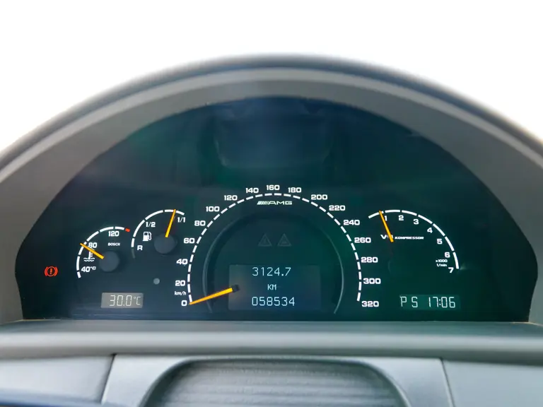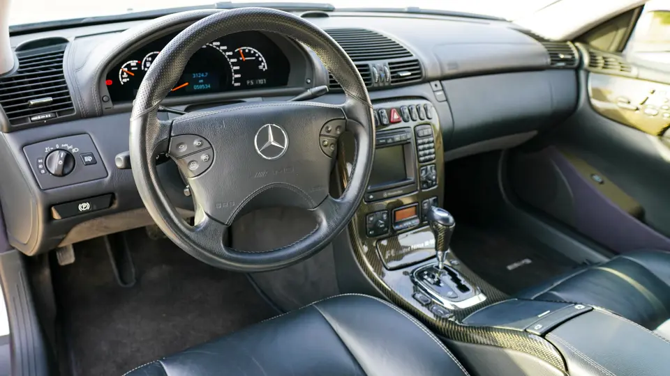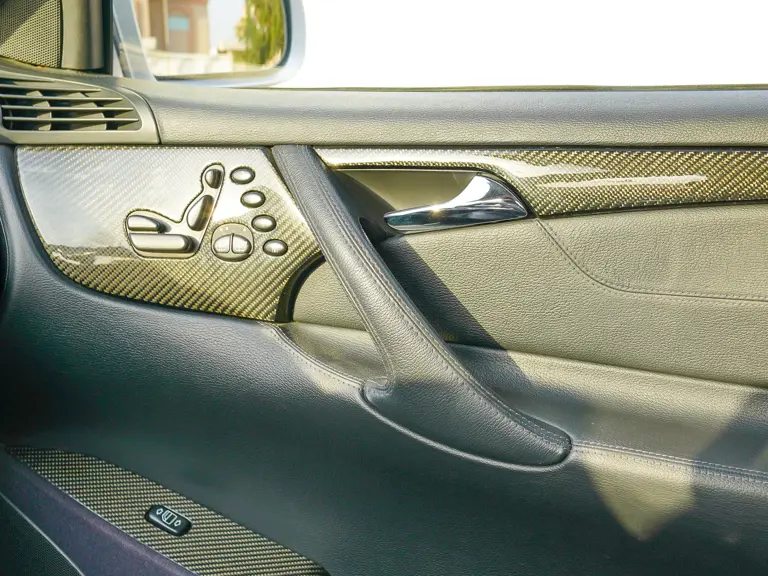 WDB215.375-1A-011732 : 18/10/2000, E55 AMG F1, 35e/55, toit ouvrant électrique, garnitures intérieures carbone, sièges chauffants à réglages électriques noirs à inserts crème, contrôles à activation par la voix, cruise-control, téléphone, télévision, store lunette arrière, Argent métallisé laqué, cuir noir Designo.