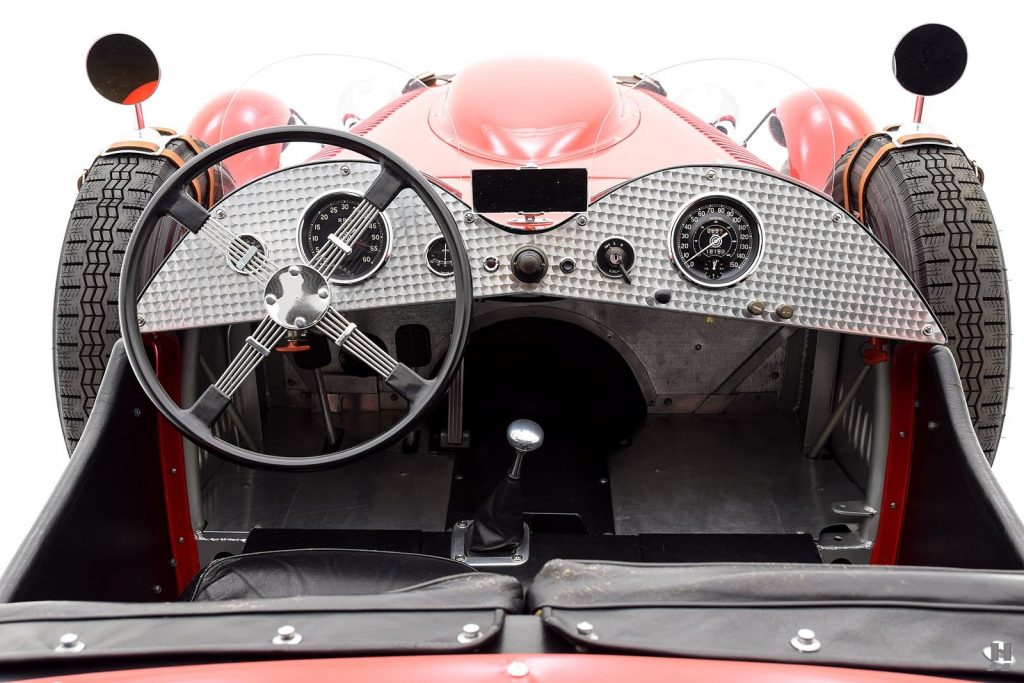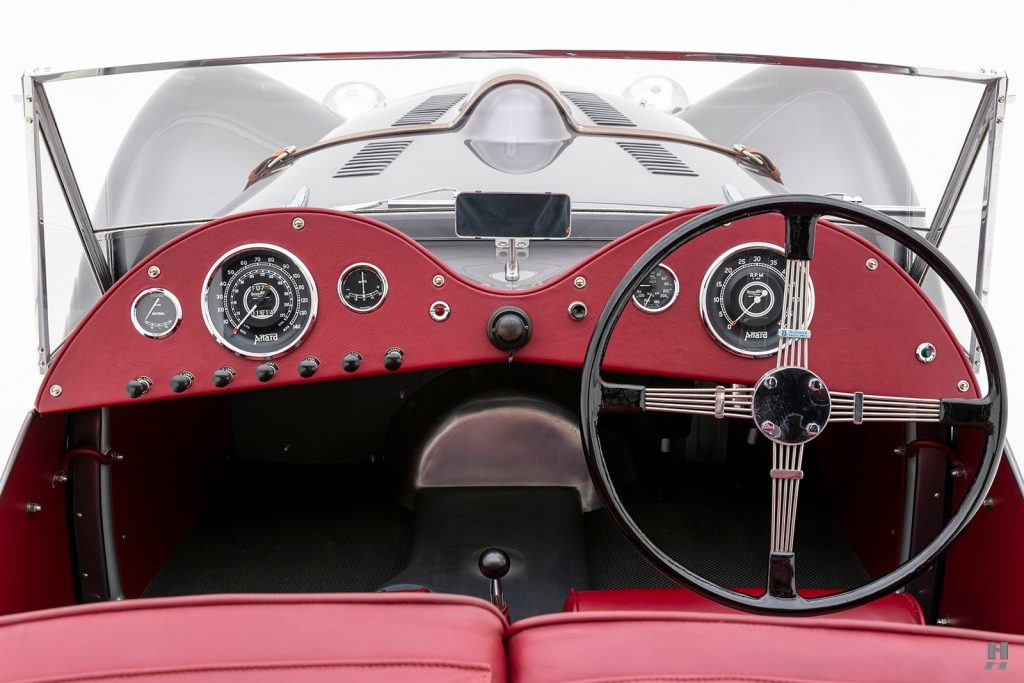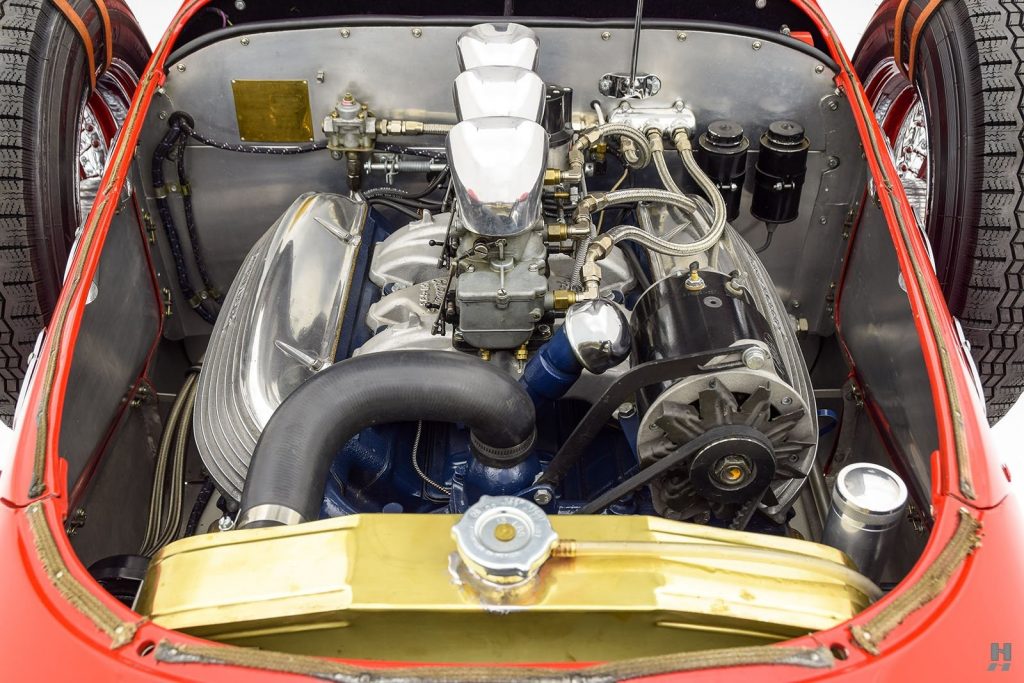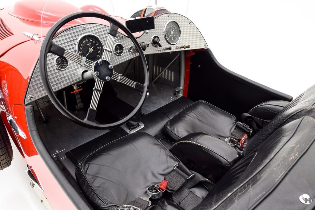 Moteur Cadillac 331 ci, pistons forgés, arbres à cames retravaillés, 6 carburateurs Stromberg 97, freins à tambours Alfin, transmission Lincoln Zephyr, Rouge Ferrari, cuir noir.