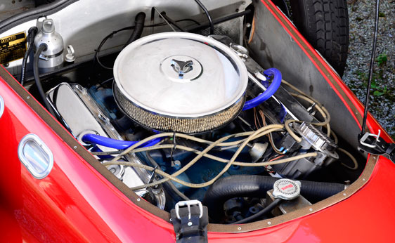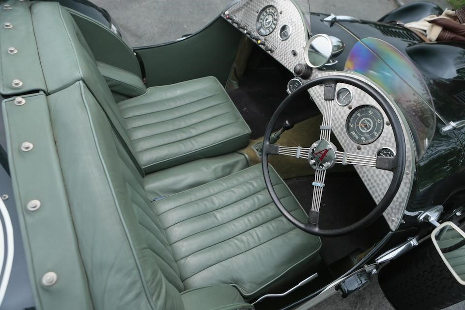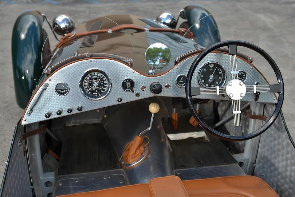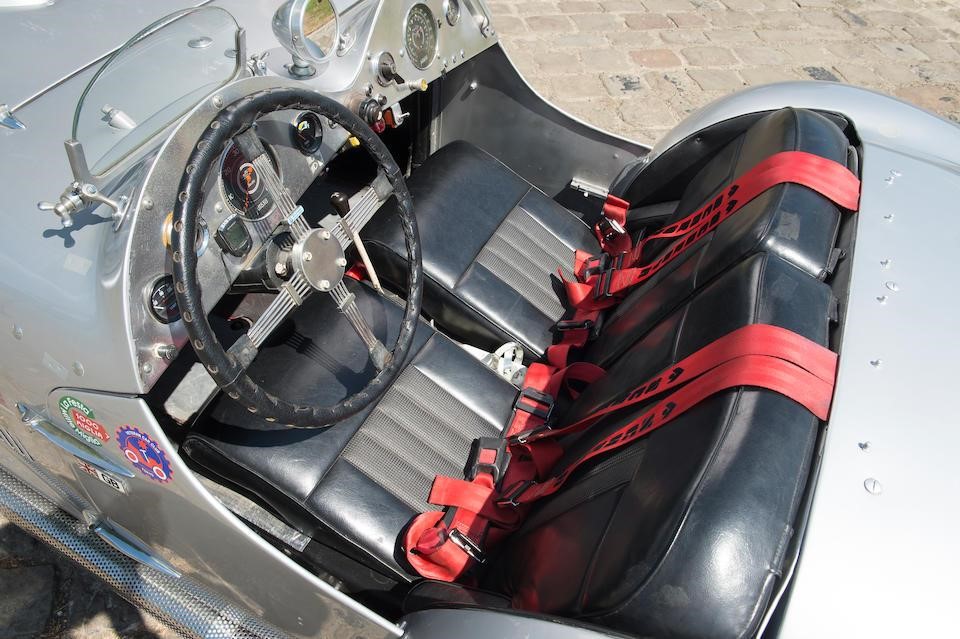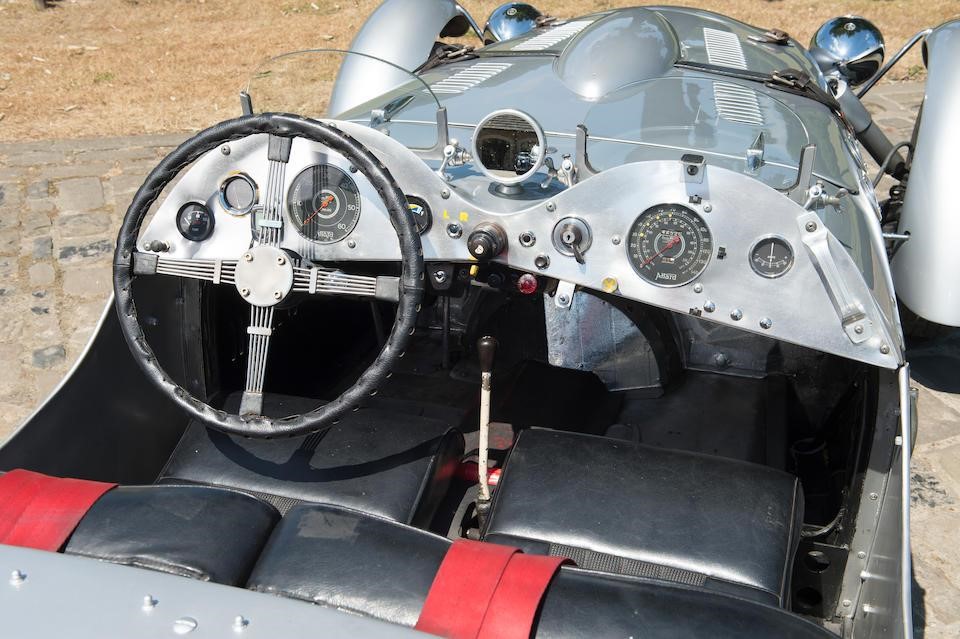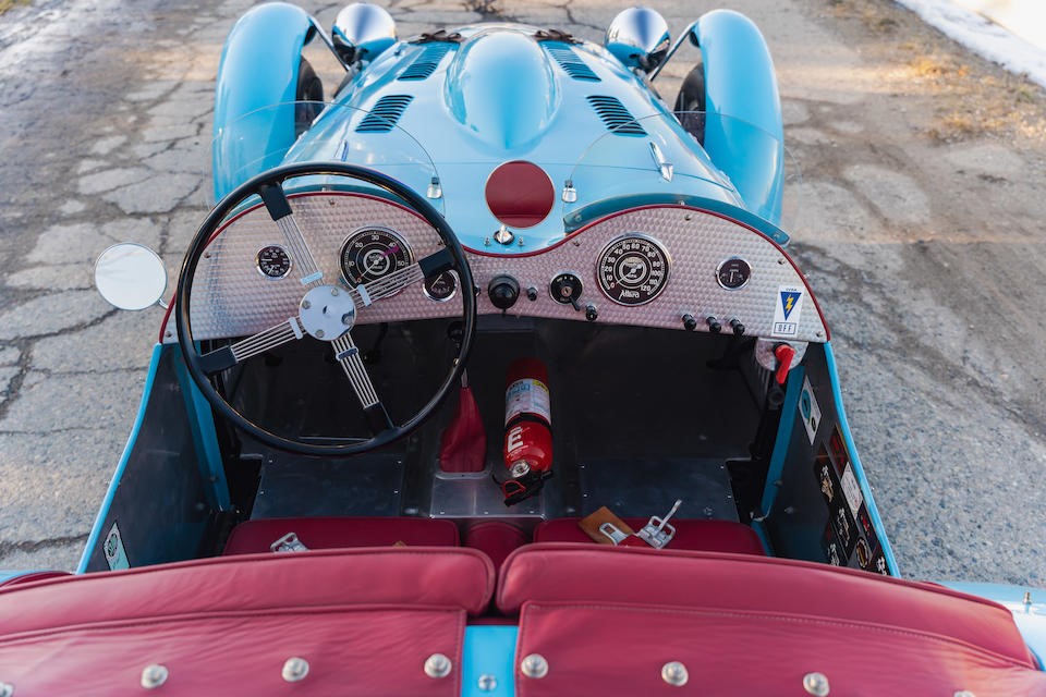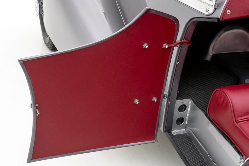 Compteurs Stewart-Warner, tachymètre Moon Eyes, ailes arrières métal poli, goulotte d’essence Monza, roue de secours sur l’aile, saute-vent conducteur et passager en perspex, rétroviseur extérieur chromé Ray Dot, pont arrière De Dion avec différentiel de Jaguar E Type, ressort à lames transversal avant, amortisseur de direction, amortisseurs Carrera, freins Alfin, extincteur.