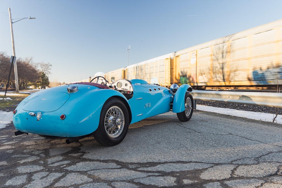 99J1974 : 1951, J2 Roadster, moteur Cadillac, Bugatti Blue, cuir bleu.