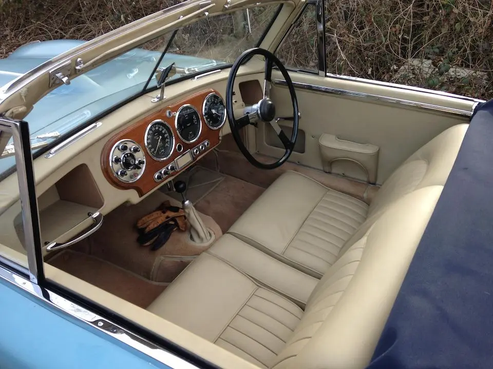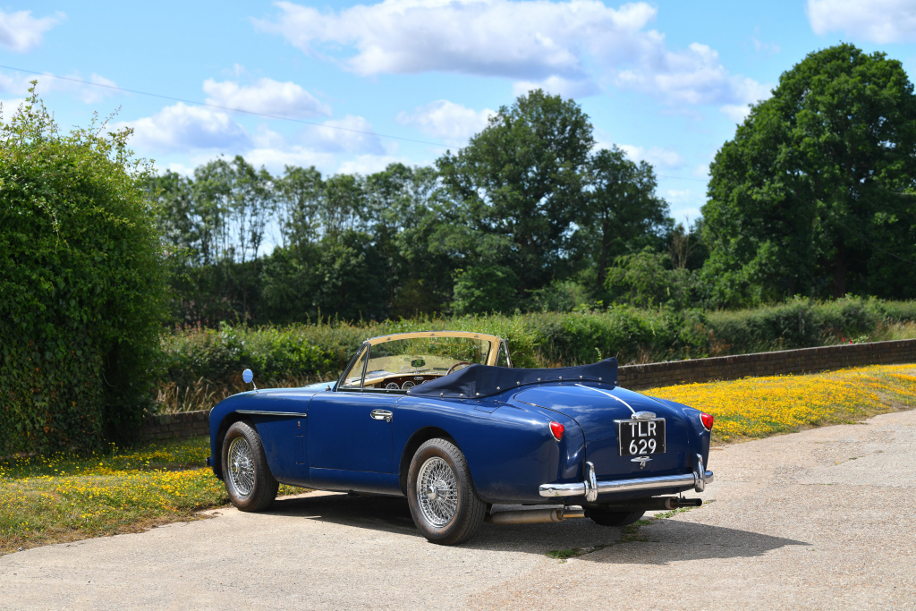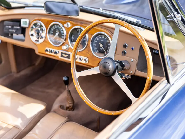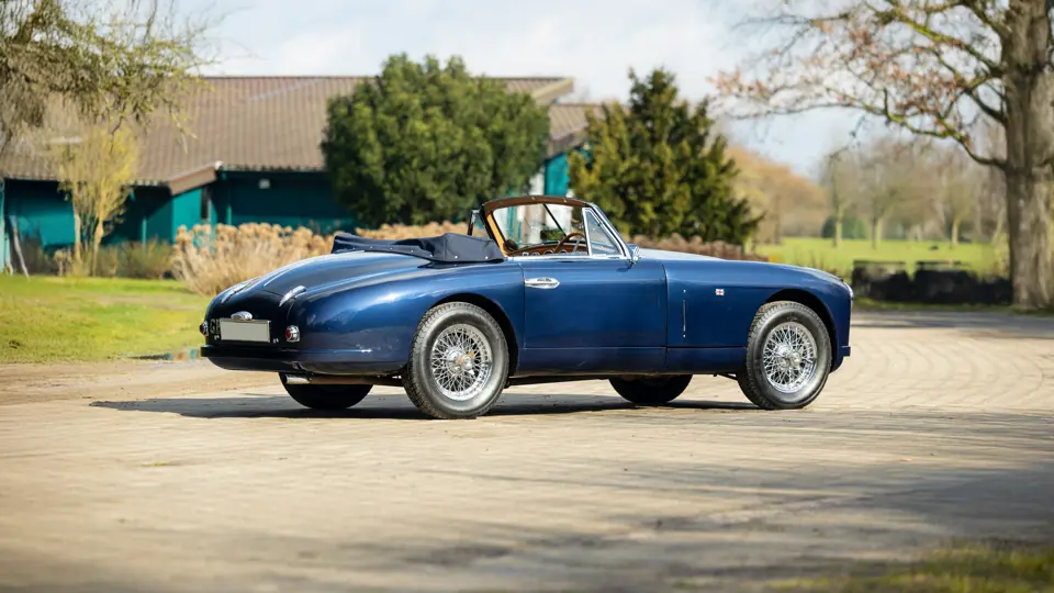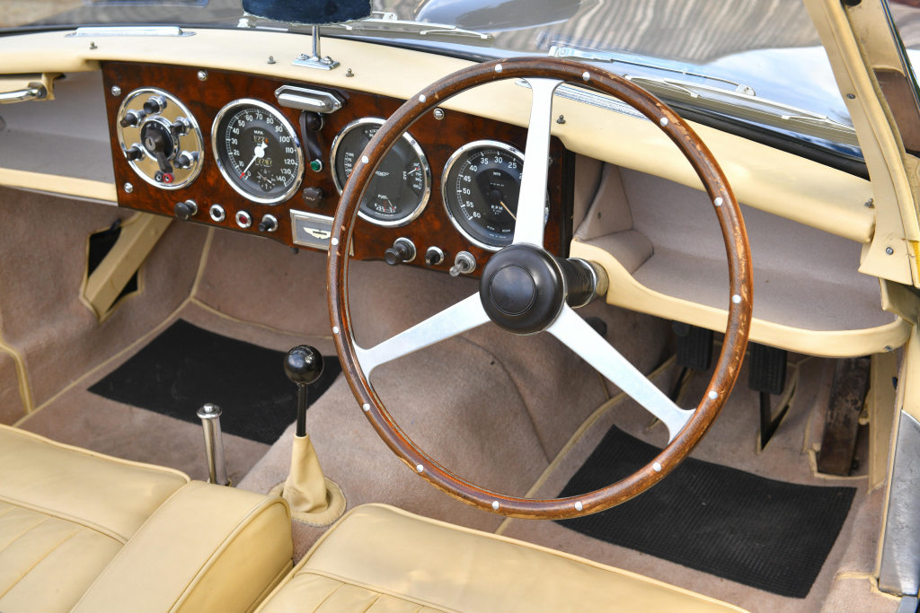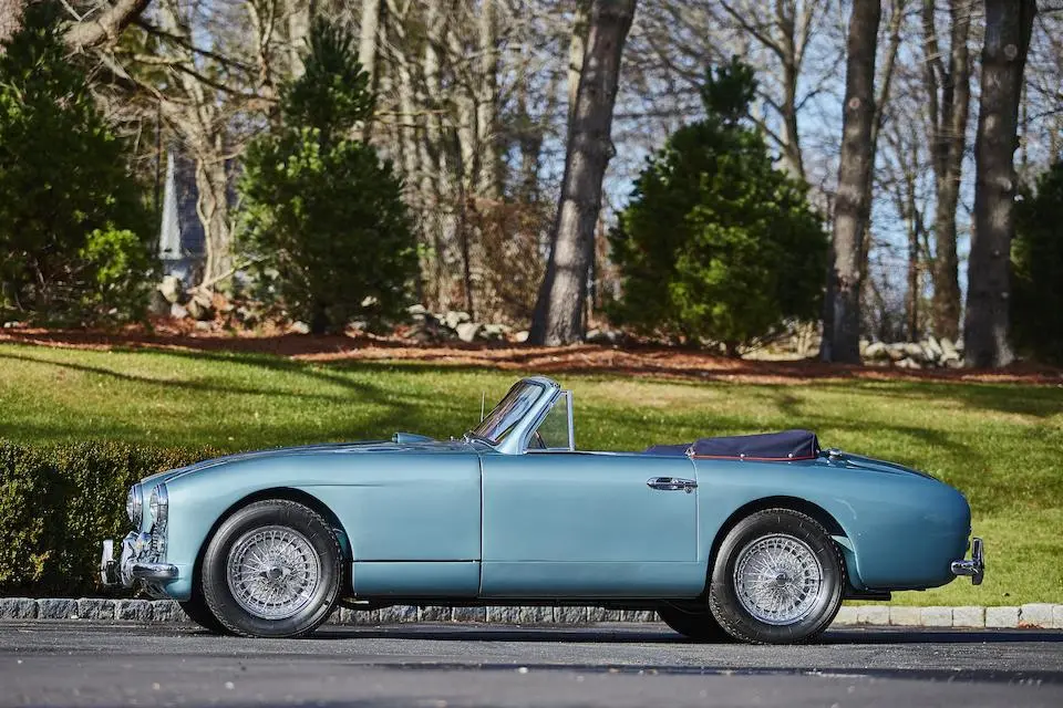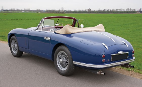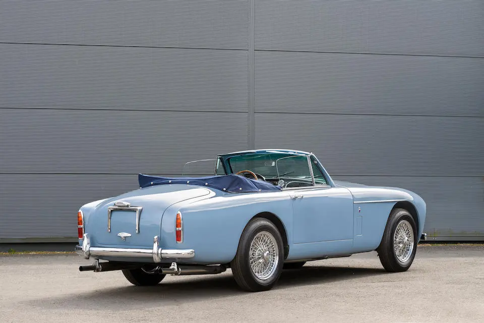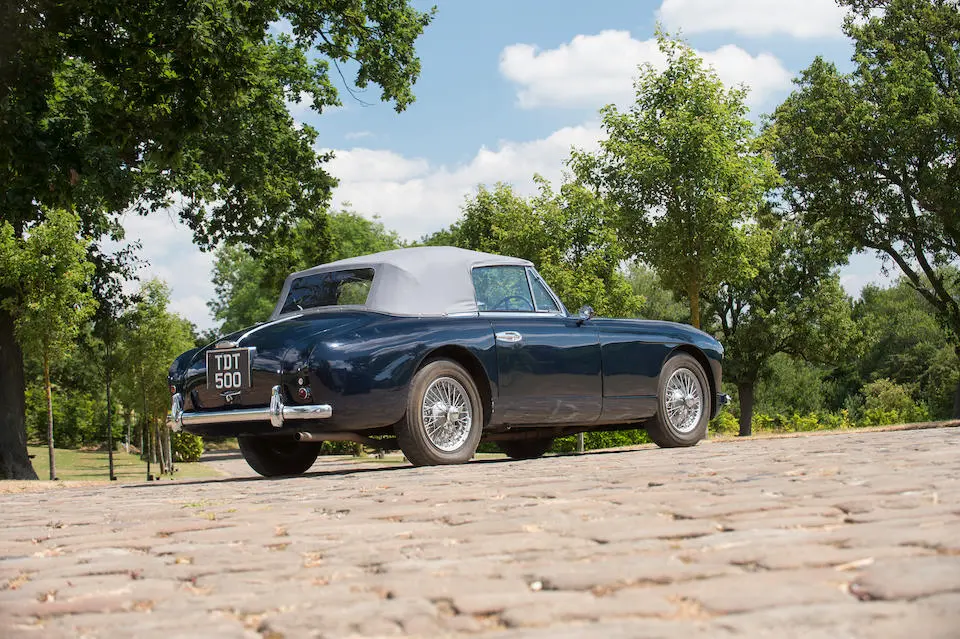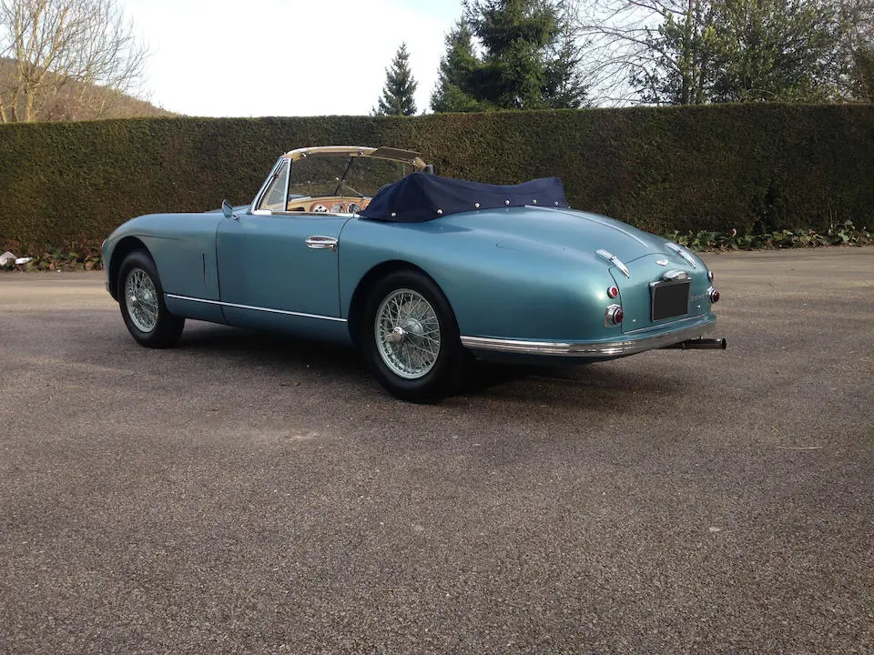 AM300/3/1490 : 1958, DB2 MK3 Drophead Coupé, 2 carburateurs SU, overdrive Laycock de Normanville, jantes à rayons chromés à fixation centrale et papillon à 2 oreilles, rétroviseurs d’ailes chromés, volant 3 branches, instrumentation Smiths, radio, Pacific Blue, cuir rouge.