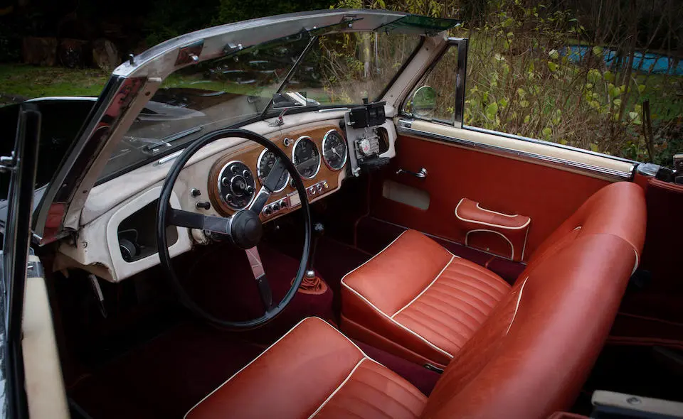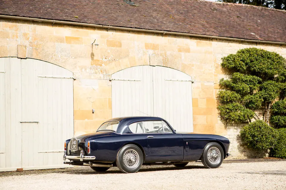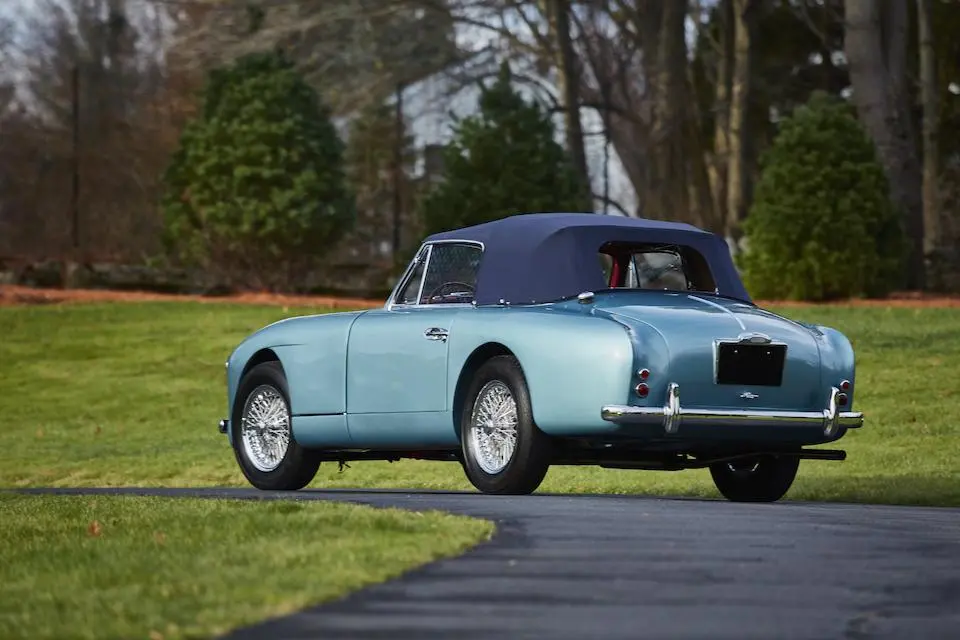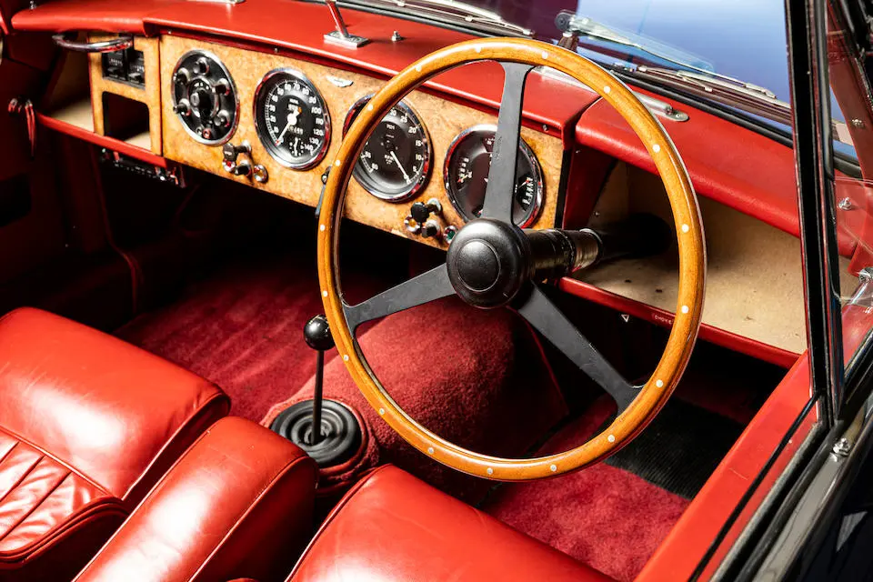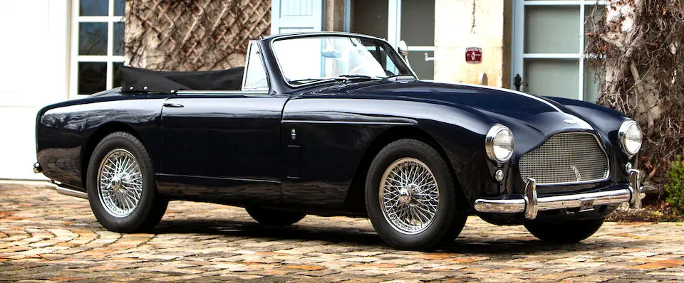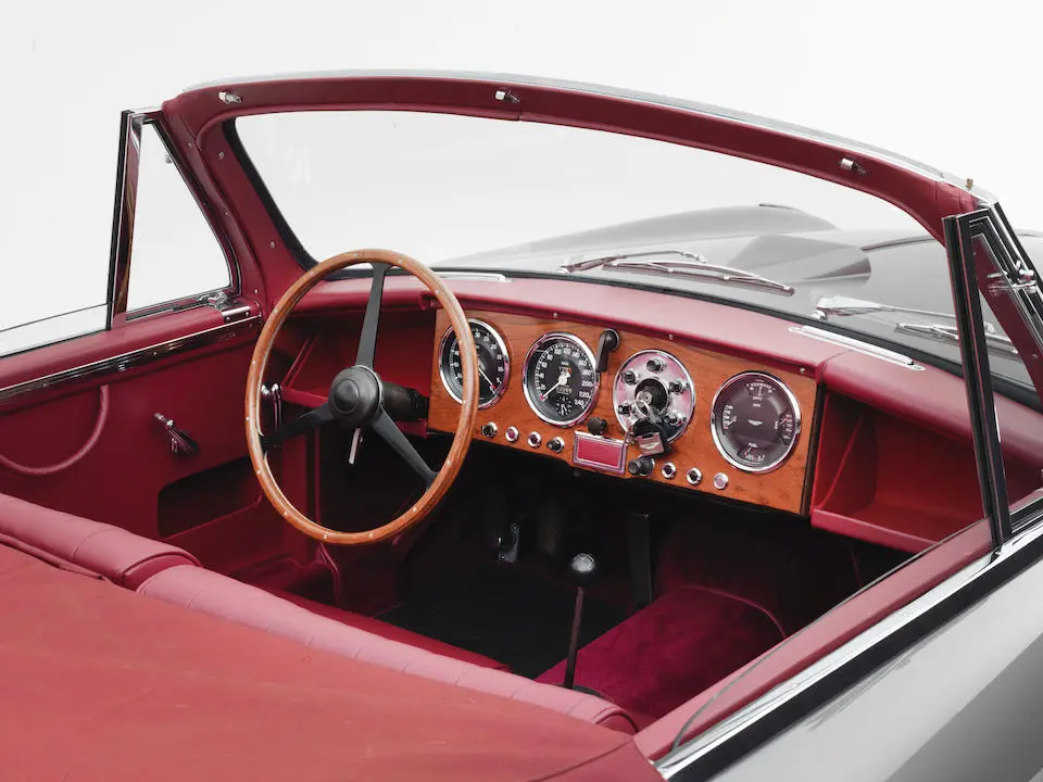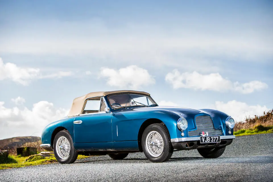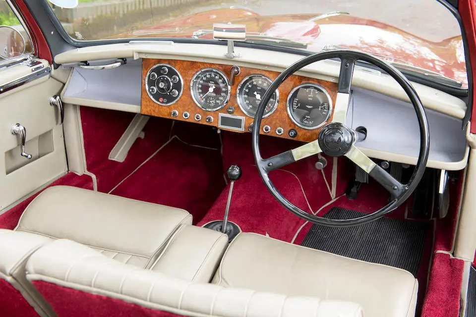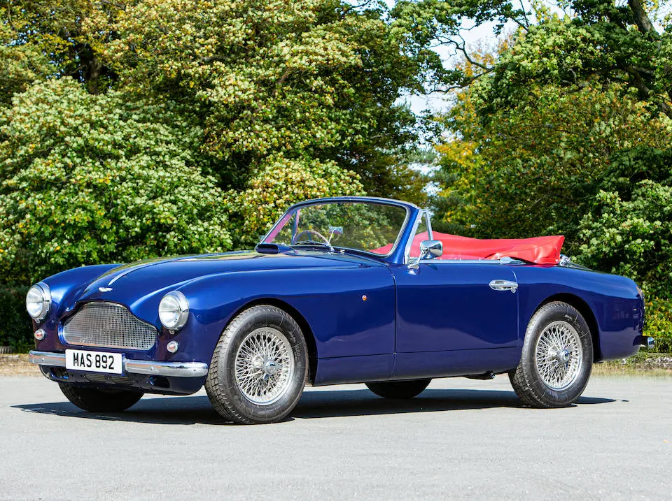 AM300/3/1490 : 1958, DB2 MK3 Drophead Coupé, 2 carburateurs SU, overdrive Laycock de Normanville, jantes à rayons chromés à fixation centrale et papillon à 2 oreilles, rétroviseurs d’ailes chromés, volant 3 branches, instrumentation Smiths, radio, Pacific Blue, cuir rouge.