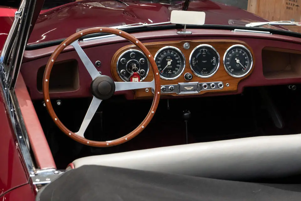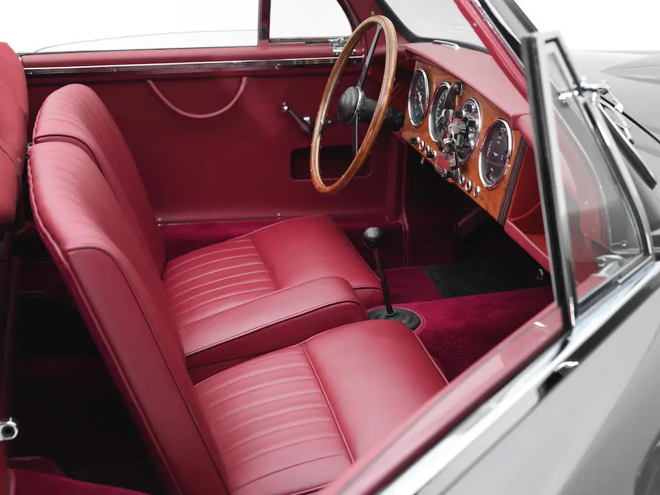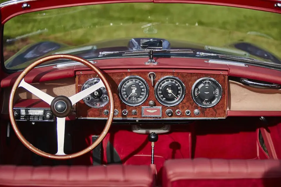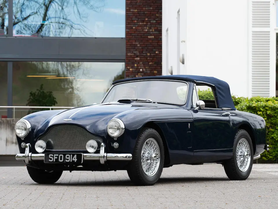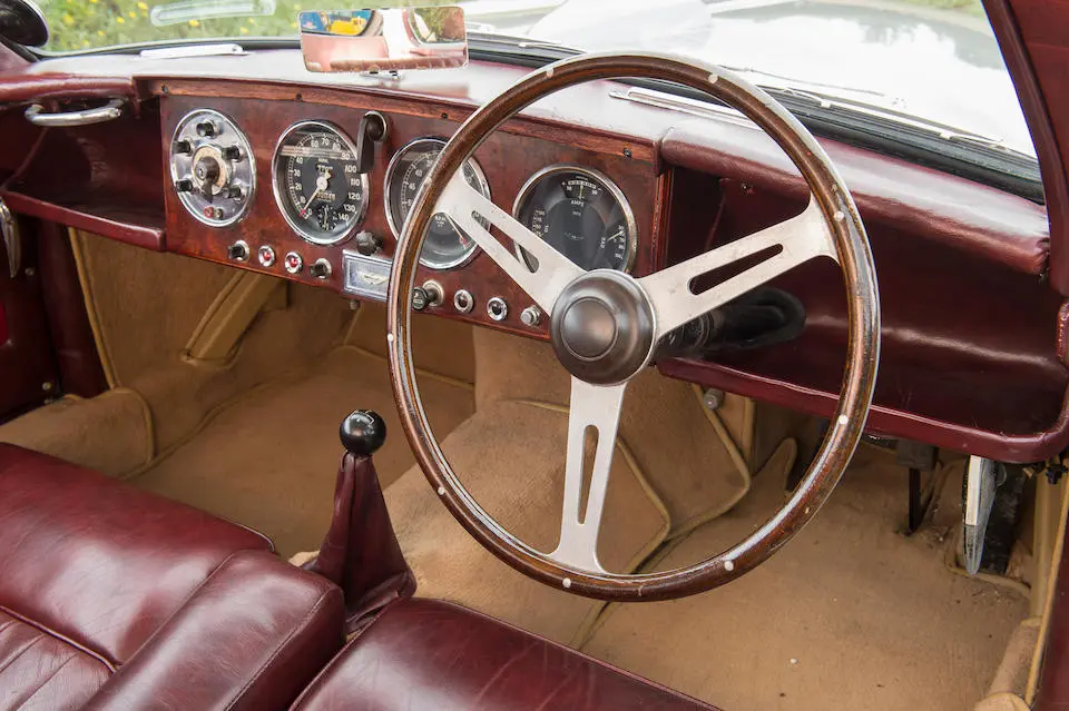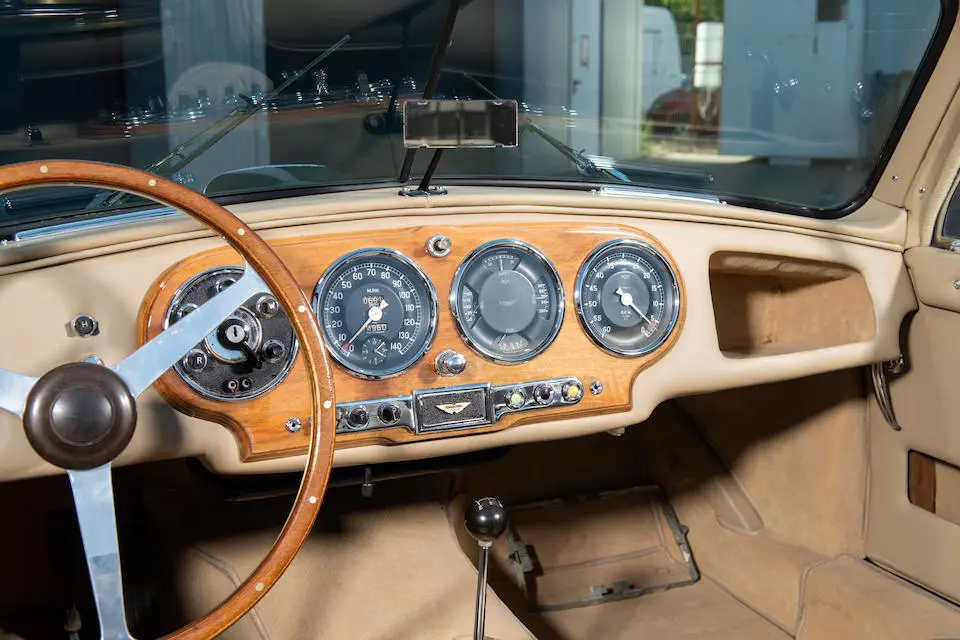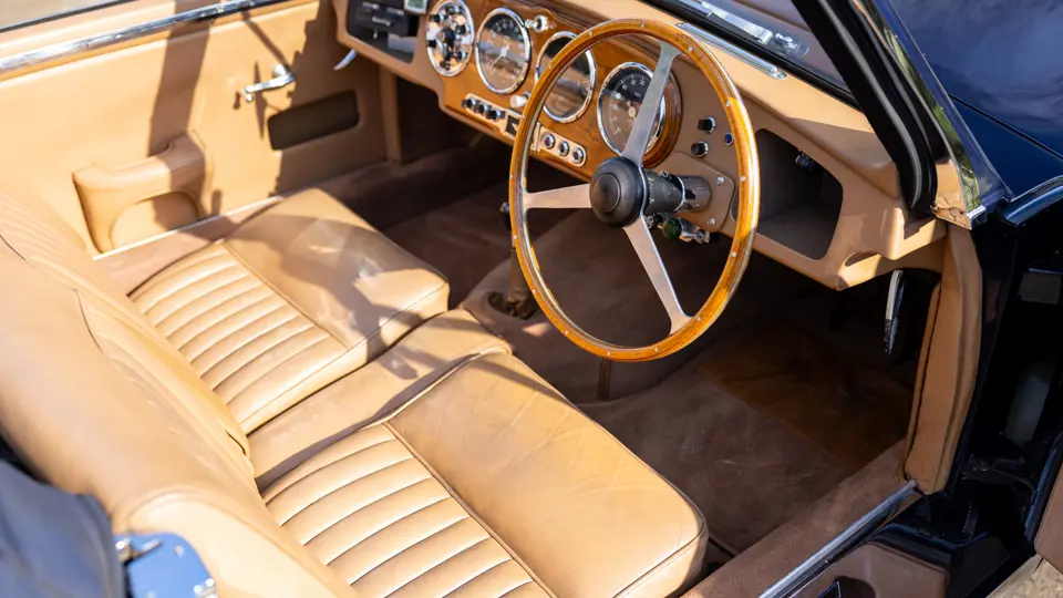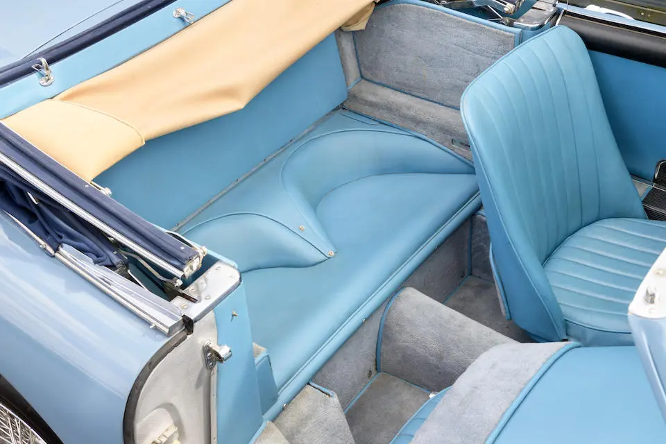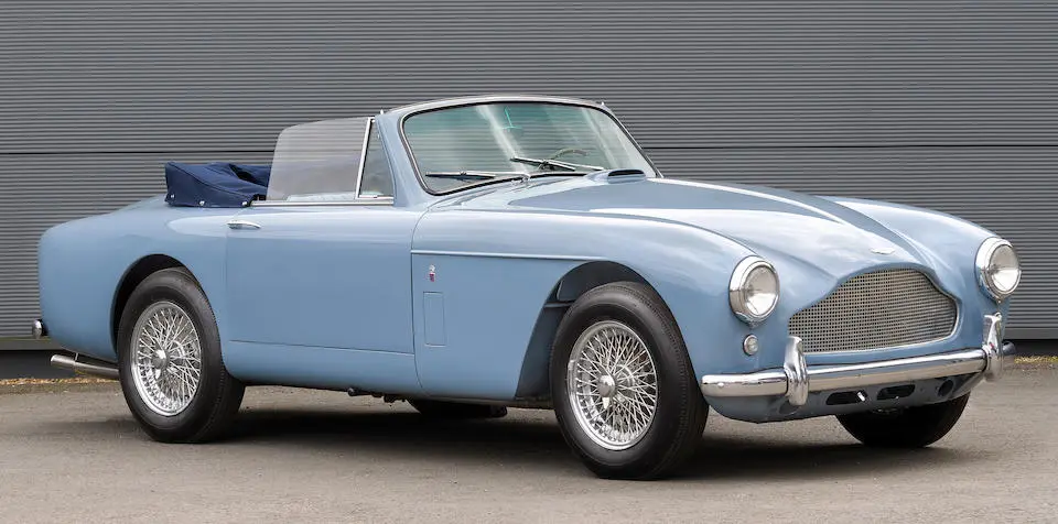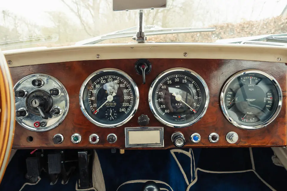AM300/3/1490 : 1958, DB2 MK3 Drophead Coupé, 2 carburateurs SU, overdrive Laycock de Normanville, jantes à rayons chromés à fixation centrale et papillon à 2 oreilles, rétroviseurs d’ailes chromés, volant 3 branches, instrumentation Smiths, radio, Pacific Blue, cuir rouge.