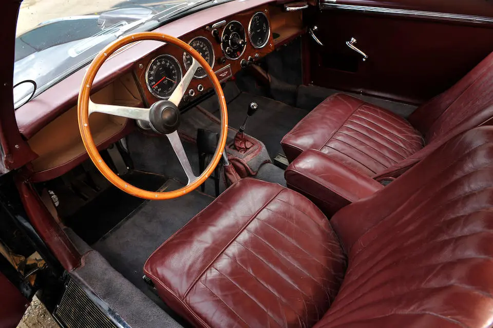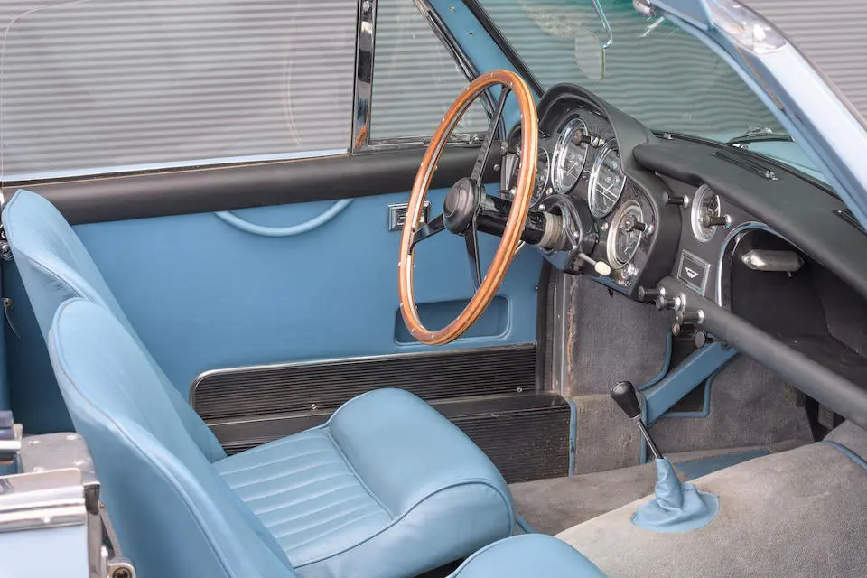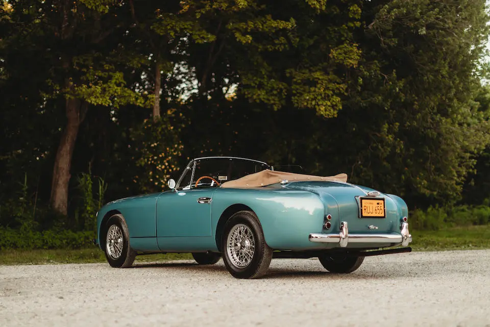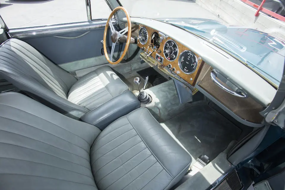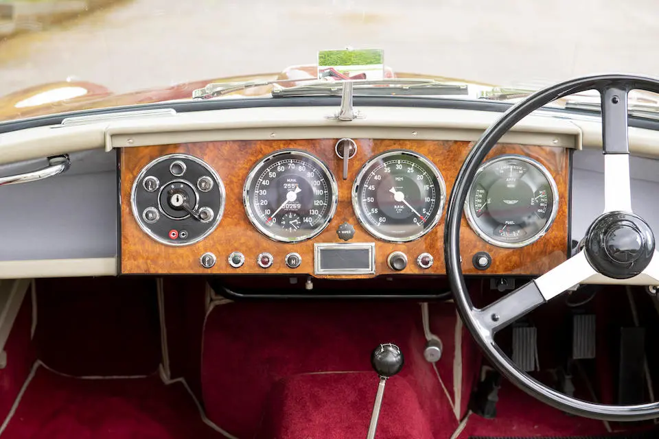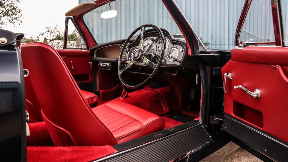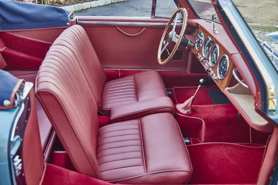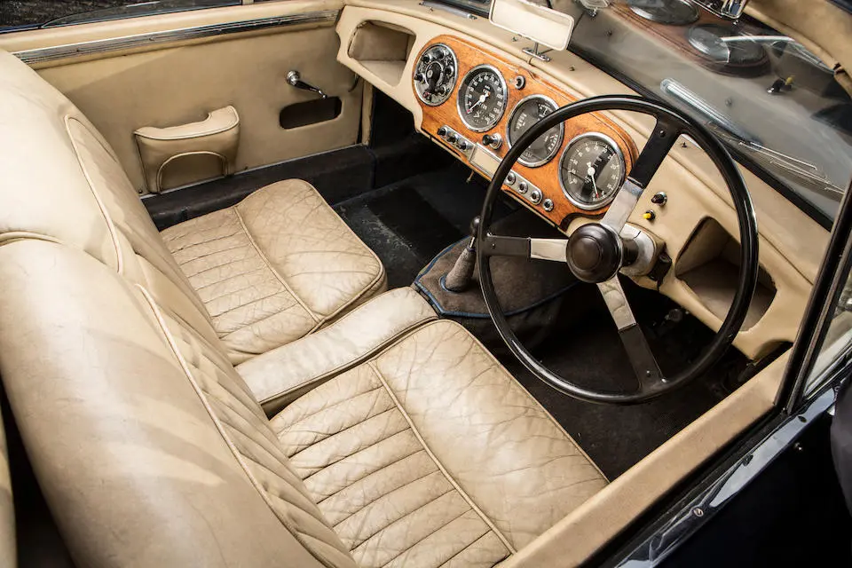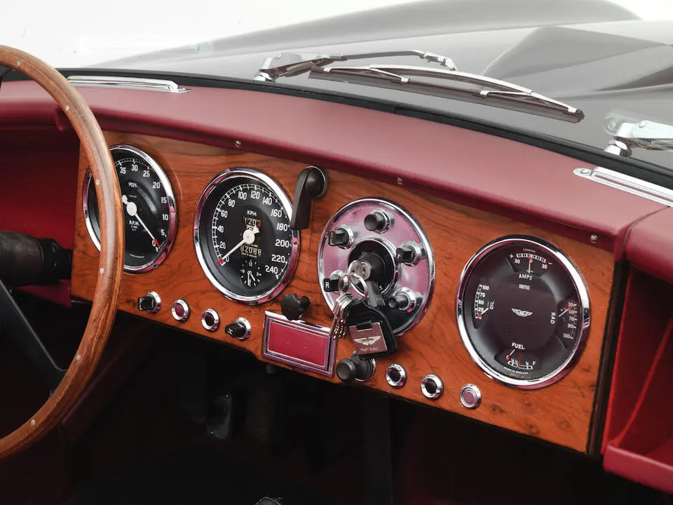 AM300/3/1490 : 1958, DB2 MK3 Drophead Coupé, 2 carburateurs SU, overdrive Laycock de Normanville, jantes à rayons chromés à fixation centrale et papillon à 2 oreilles, rétroviseurs d’ailes chromés, volant 3 branches, instrumentation Smiths, radio, Pacific Blue, cuir rouge.