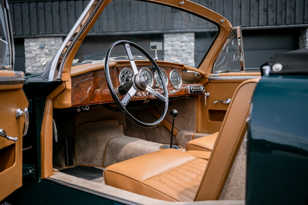 AM 300/3/1696 :  1958, MK3, moteur DBA/1297, Scotch Pine green, cuir Connolly rouge, moquettes noires, overdrive, disques avant, tambours Alfin arrières, servofrein, radiateur d’huile, double échappement, chauffage Smiths plus puissant, 2 carburateurs SU HIV6, rapport de pont 3,77 :1, 2 antibrouillards.