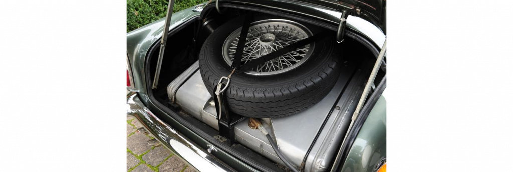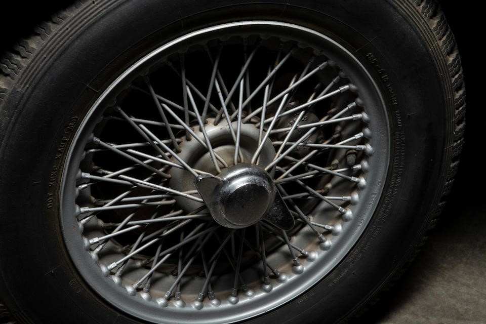 Phares carénés en Perspex, face avant avec prise d’air de capot agrandie et découpe ovale sous la calandre pour le radiateur d’huile encadrée par 2 ouvertures pour le refroidissement des freins. Roues Borrani à 42 rayons en alliage léger et jante en aluminium, moyeu de fermeture central à 3 oreilles.