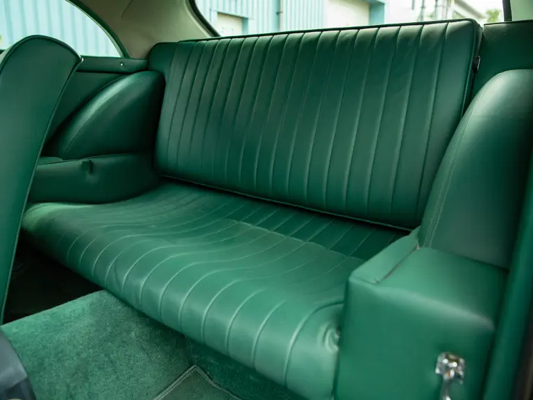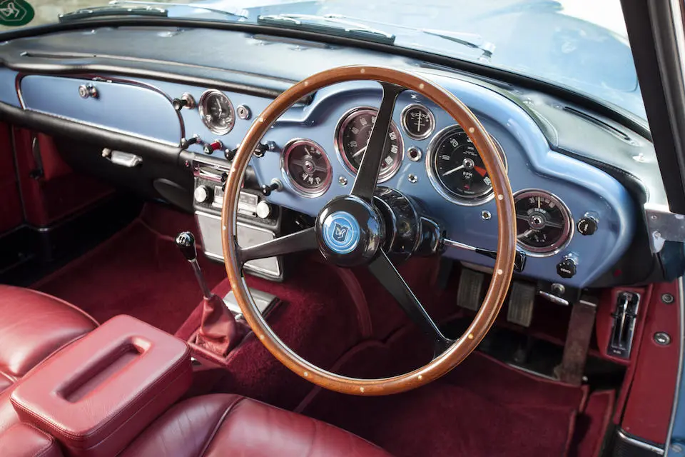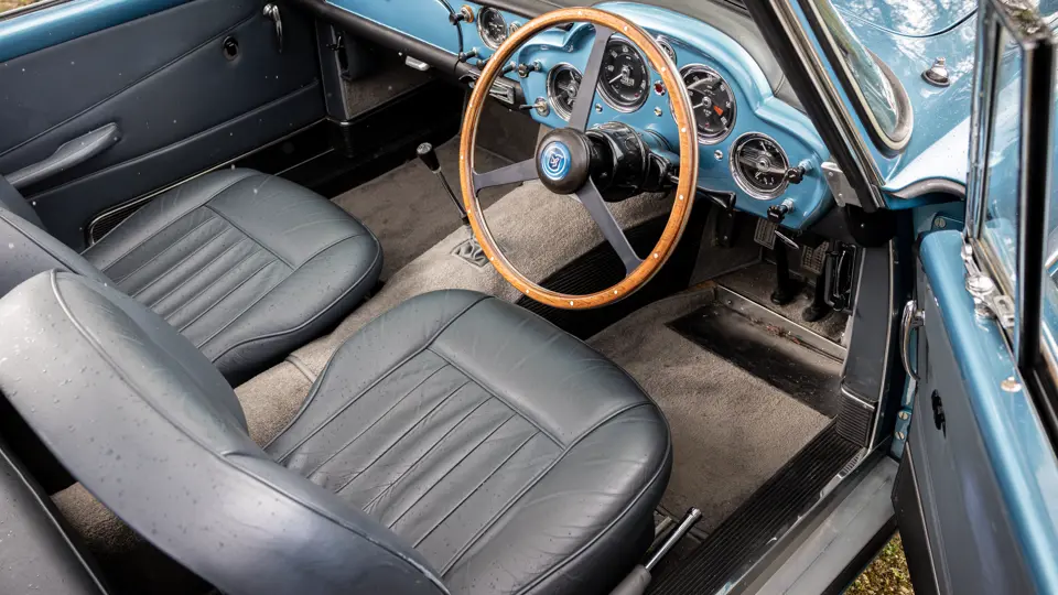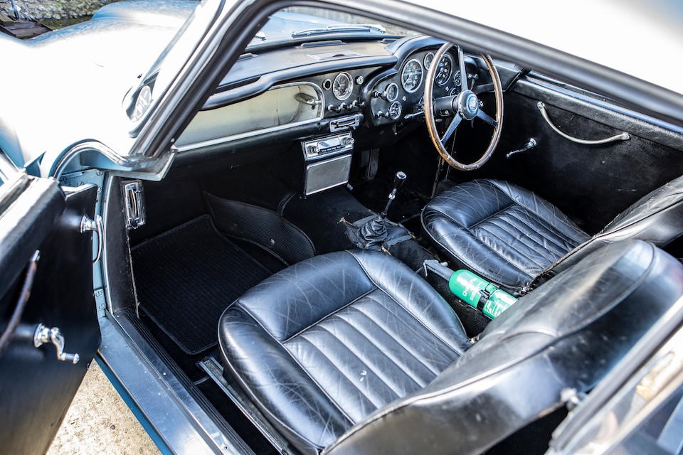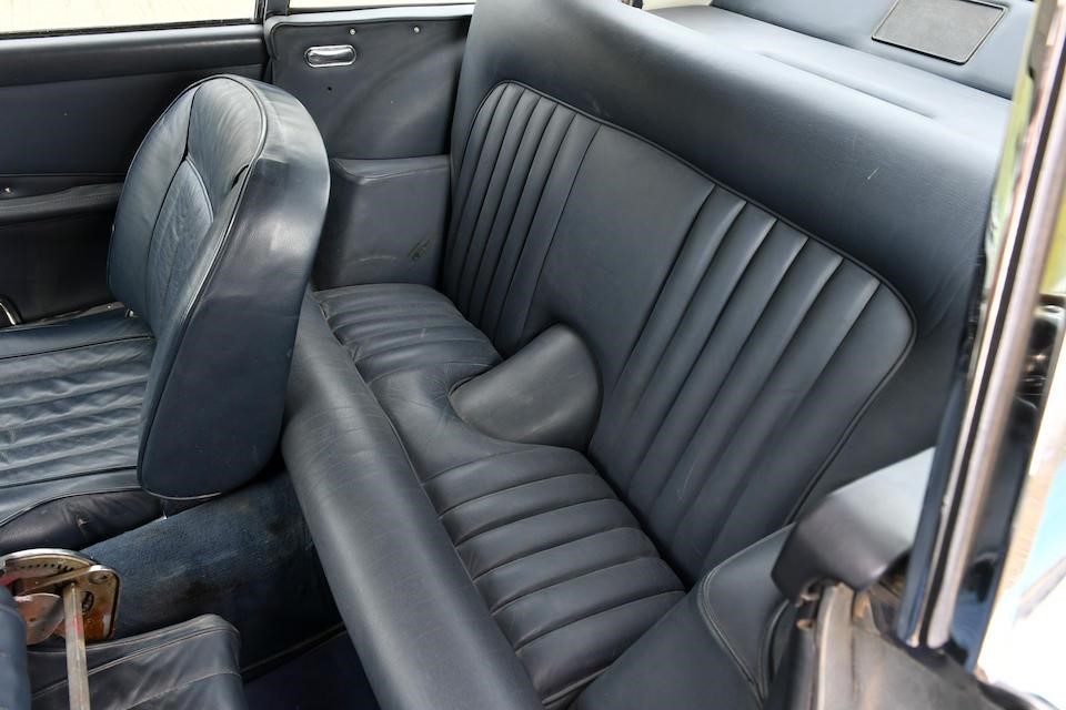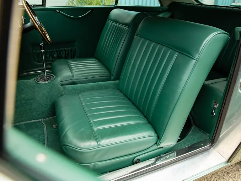 DB4/646/R : 1961, DB4 Série III Sports Saloon, moteur 370/654, boîte de vitesses manuelle avec overdrive, radiateur d’huile, phares antibrouillard Marchal, répétiteurs de clignotants sur les ailes, jantes à rayons, vitres électriques, dégivrage lunette arrière, manomètre température d’huile, soufflets de rangement dans les dossiers de sièges, Caribbean Pearl, cuir bleu foncé.