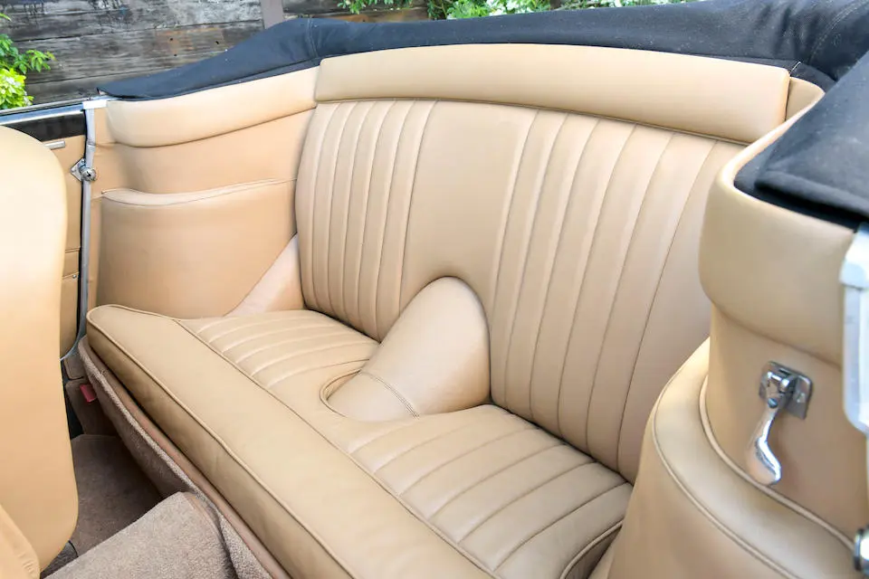 Silver sand, cuir bordeaux, moteur réalésé à 4 litres converti à une utilisation avec essence sans plomb, direction assistée Adwest de S2, appuie-tête, repose pied passager d’Aston Martin V8.