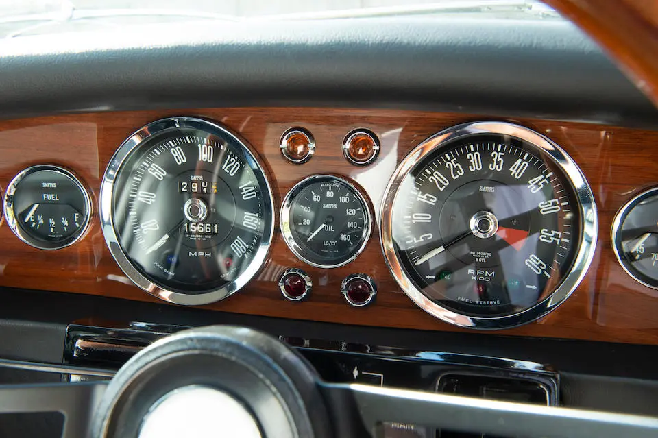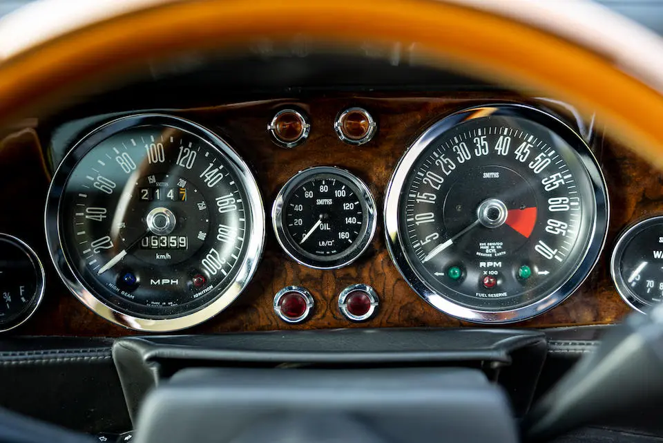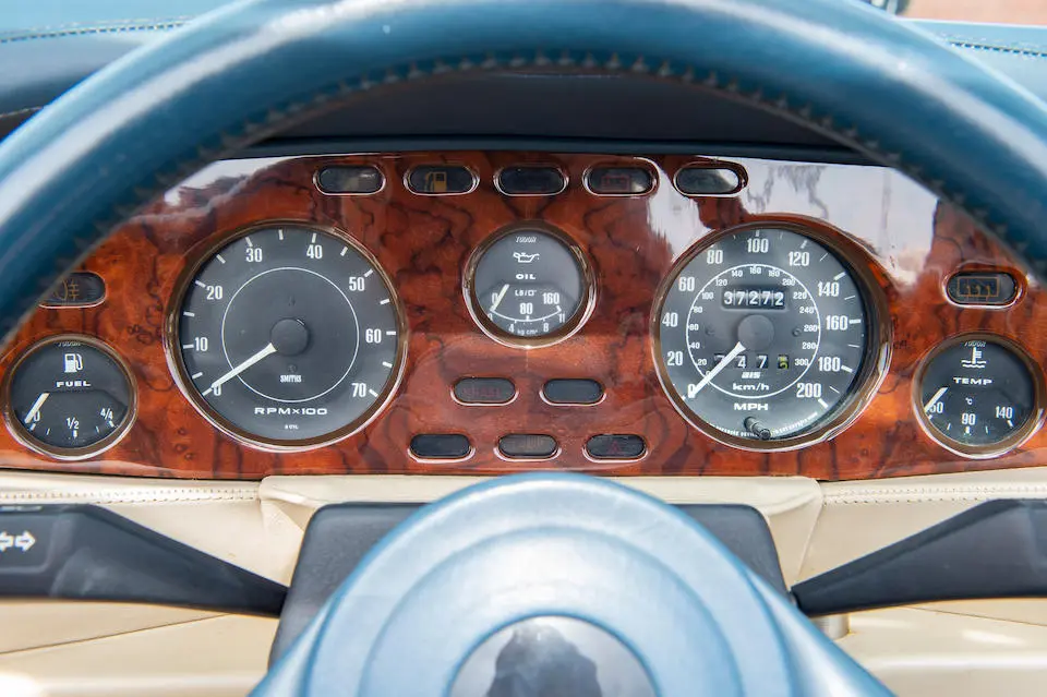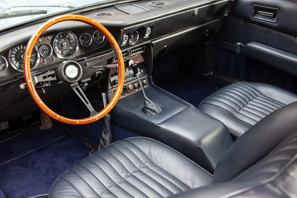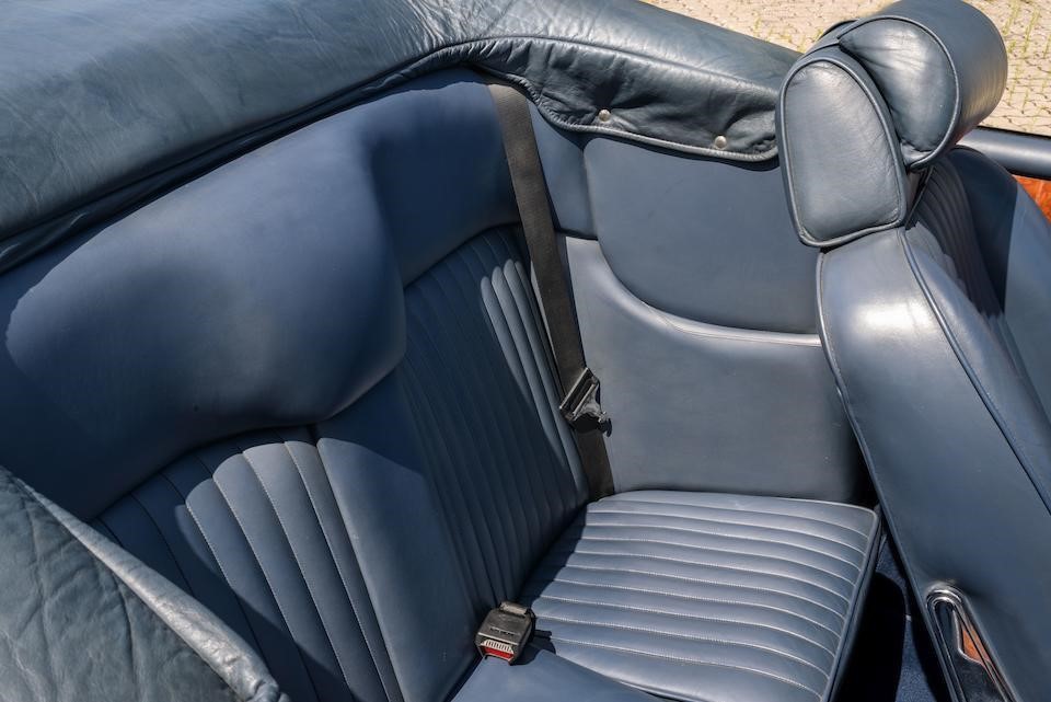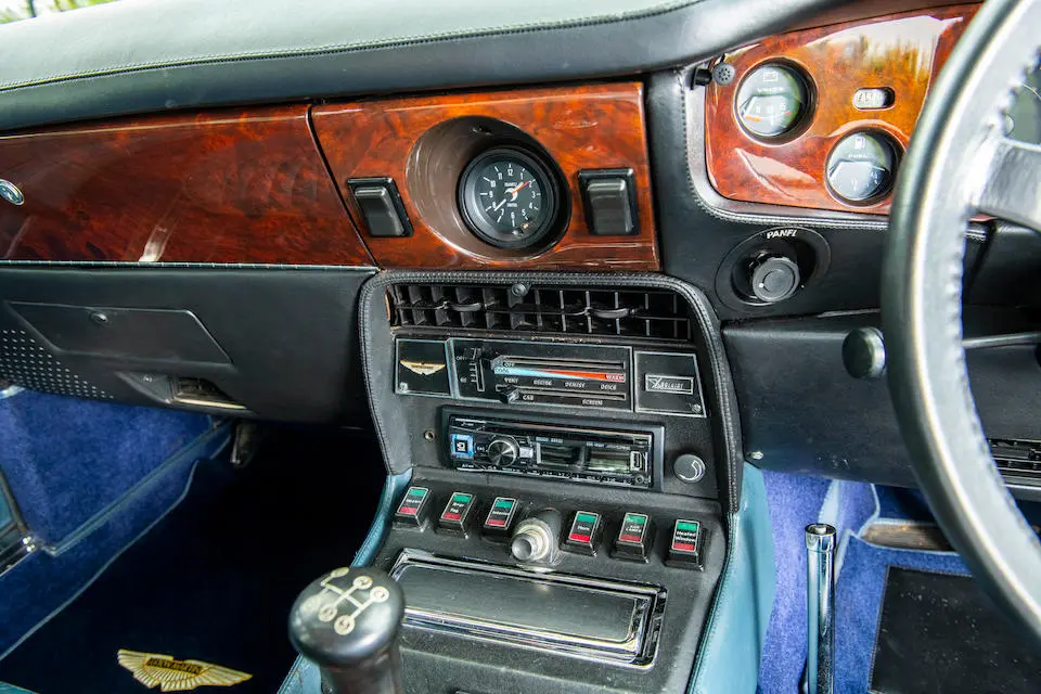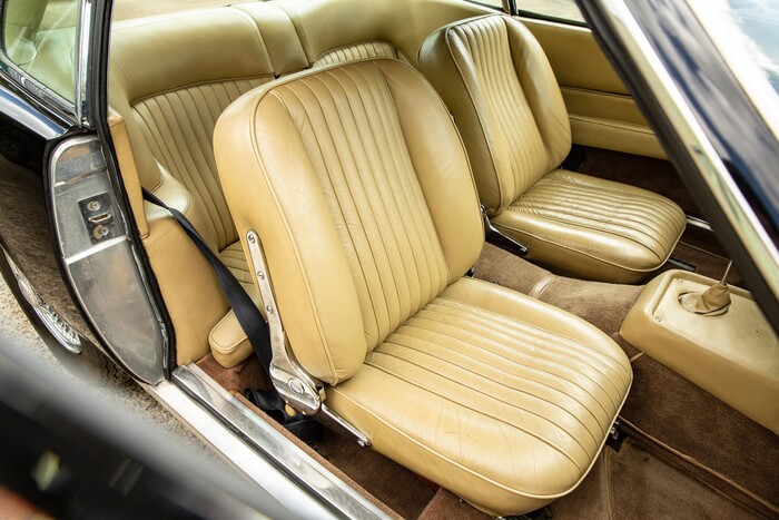 DBS/5199/L : 1969, DBS Vantage, 1/70, CAG, moteur 400/3739/SVC, boîte de vitesses manuelle, direction assistée, avertisseurs sonores Fiamm, phares antibrouillard et feux de route Marchal, climatisation Coolaire, radio Motorola, Jaguar Opalescent Blue, cuir rouge.