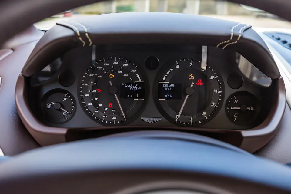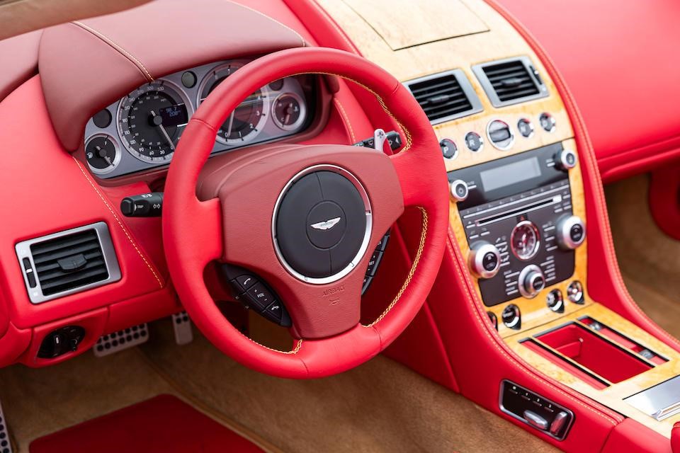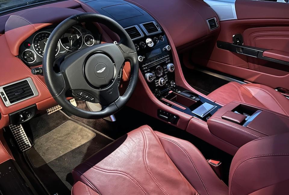 La DB9 retient la finition classique des Aston Martin avec intérieur cuir, moquettes pure laine, boiseries en acajou ou noisetier ou bambou.
