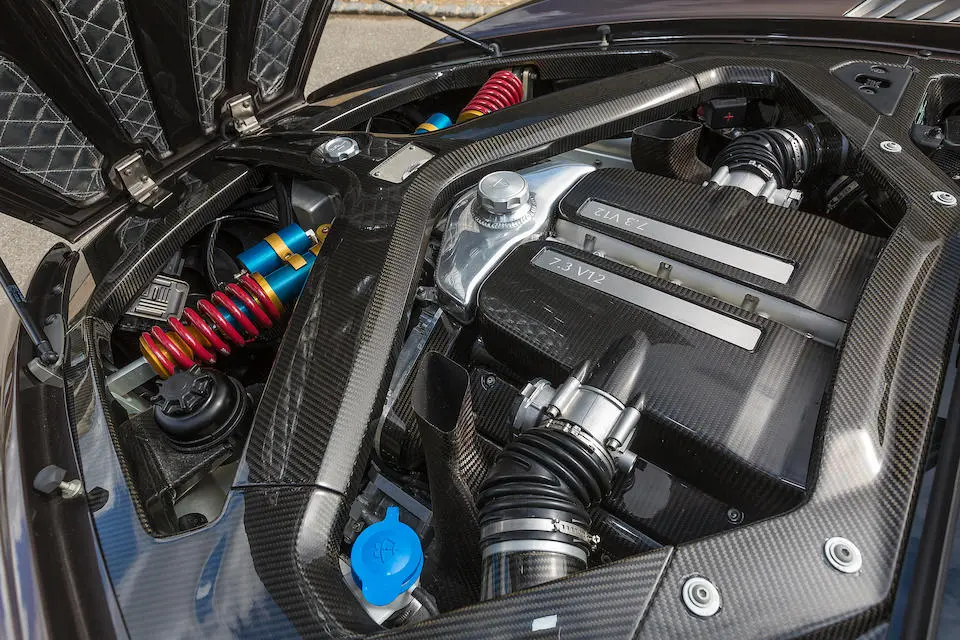 Moteur V12 porté à 7,3 litres et revu par Cosworth avec lubrification par carter sec ce qui permet de le positionner 10 cm plus bas dans le châssis, très en arrière du train avant pour améliorer la répartition des masses. 750 chevaux.