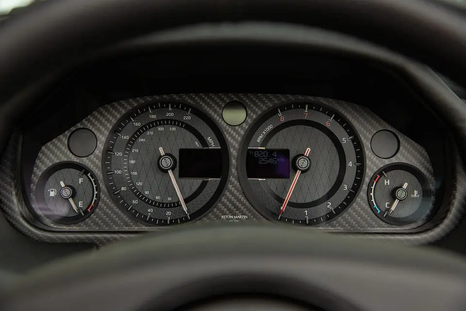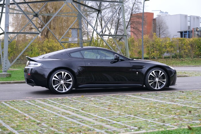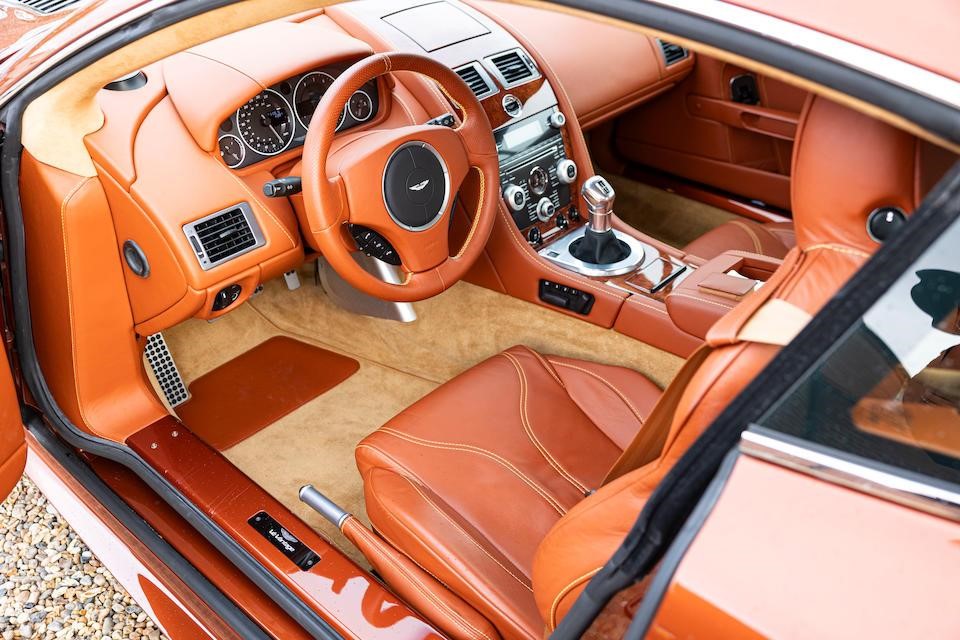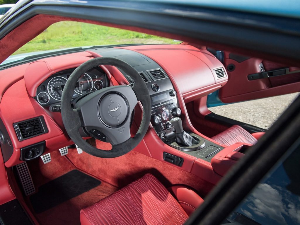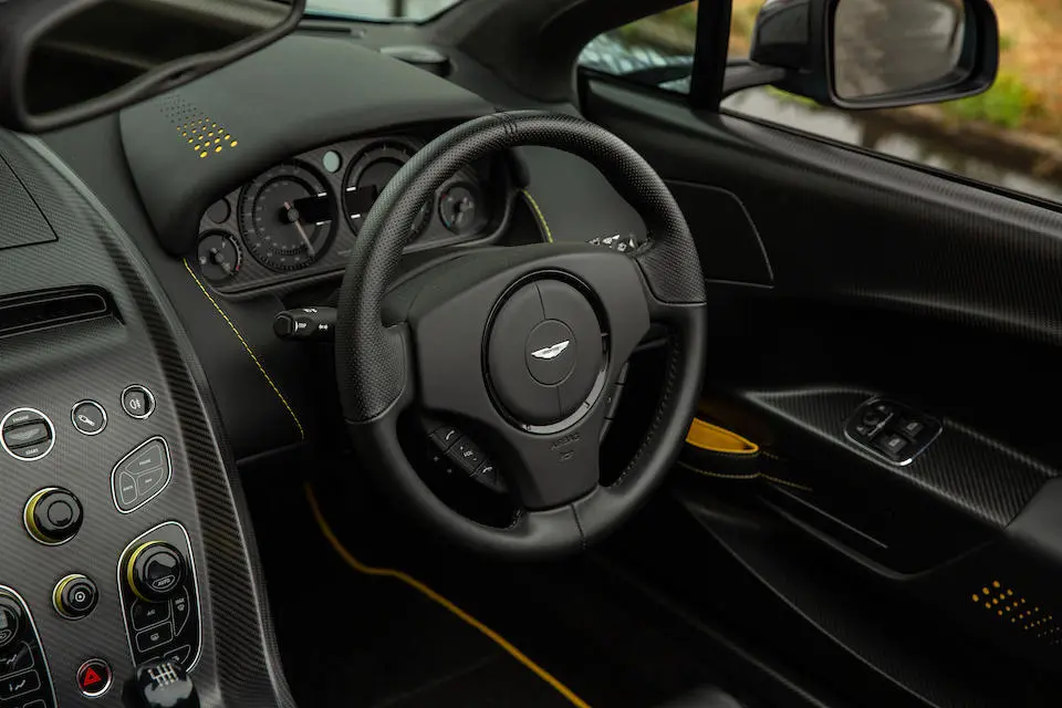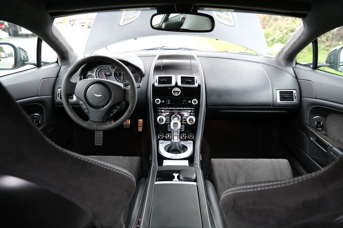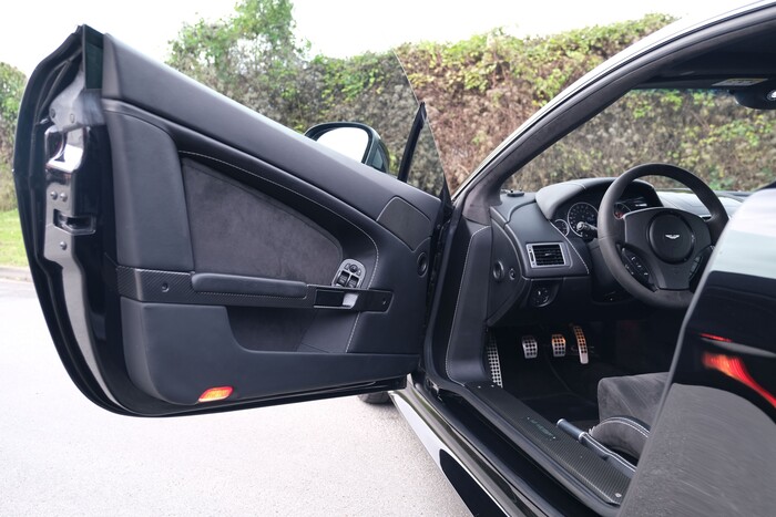 Calandre grillagée, nouveaux feux arrières, bas de caisses redessinés, phares xénon. Sièges à commande électrique à mémorisation, chauffants et ventilés, garnis de cuir noir passepoilé, plan du circuit du Nürburgring brodé dans l’accoudoir central, tableau de bord alu avec plaque du modèle, GPS, système audio Aston Martin Premium 700W, bluetooth. 3 couleurs disponibles : Bergweg Black, Karussell Orange, Lightning Silver.