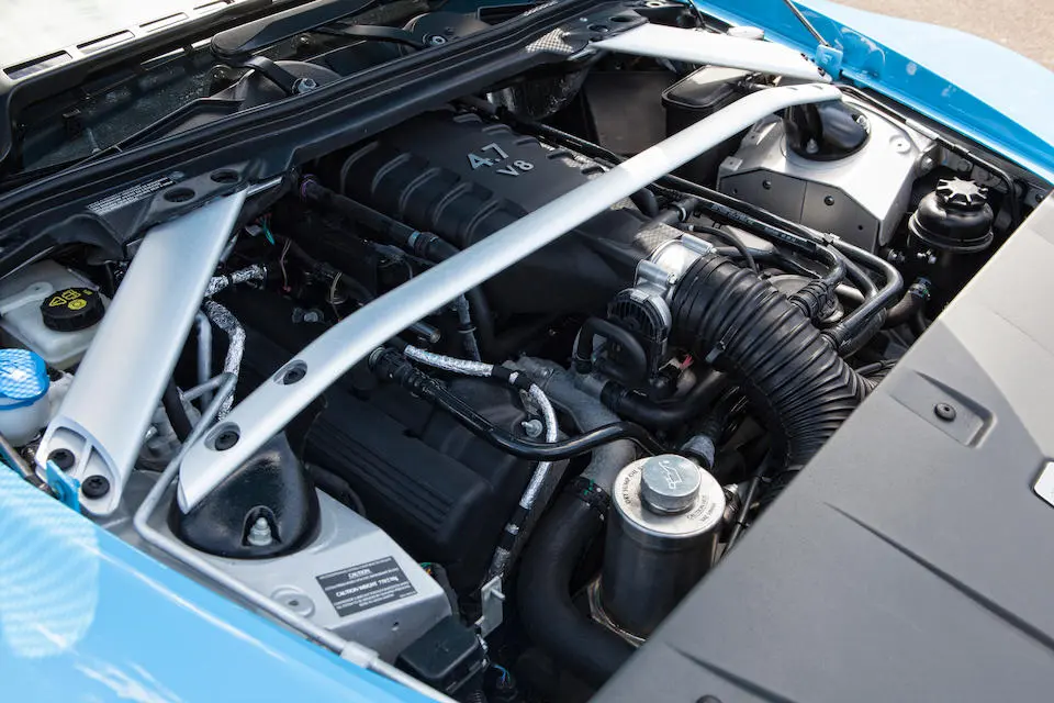 Aston Martin installe une lubrification par carter sec permettant de positionner le moteur plus bas dans le châssis.
