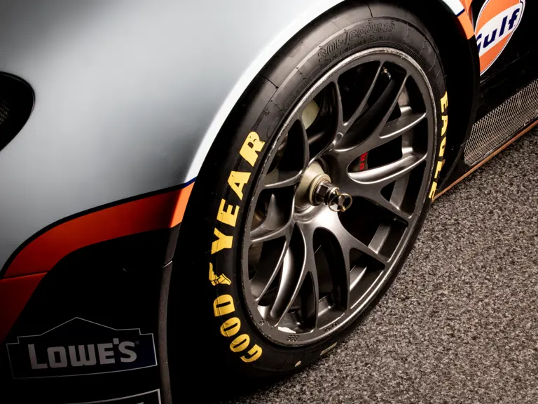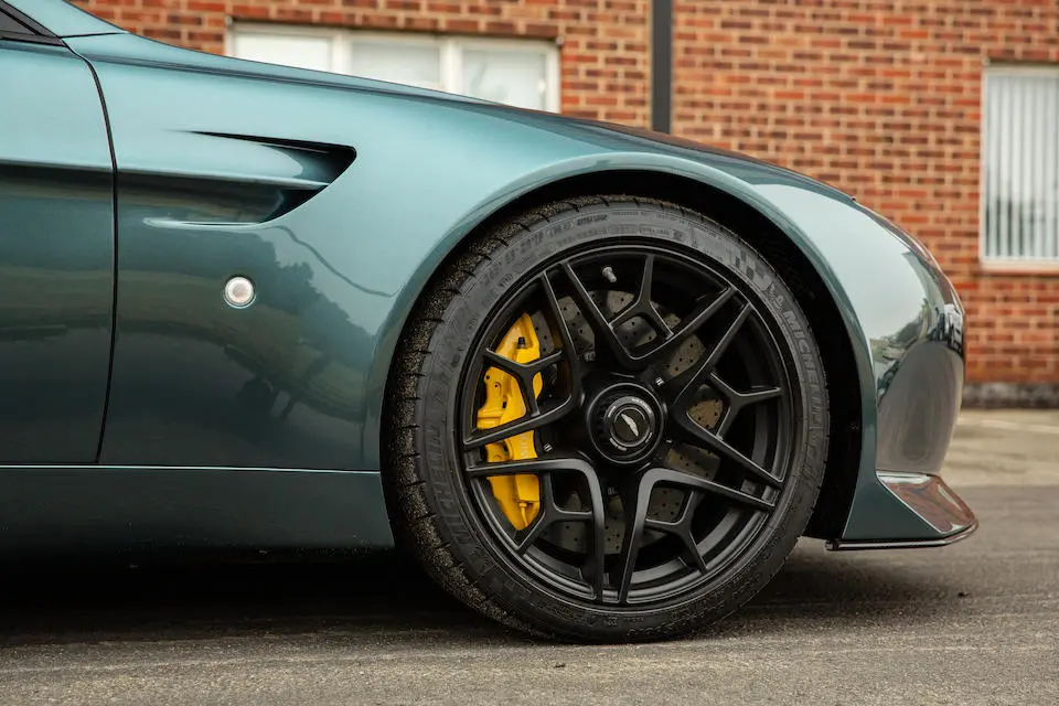 Jantes en alliage léger nid d’abeilles 21″ reprises de la Valkyrie, pneus Michelin Pilot Sport S5 à gomme hybride Dual Sport pécialement étudiés pour le modèle.