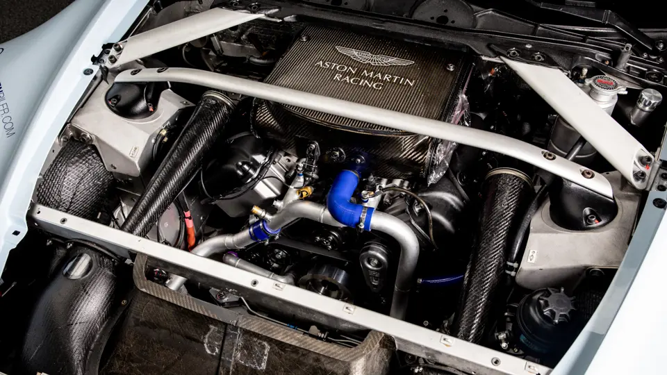 La voiture dispose du moteur de la Vantage porté à 4,5 l, d’une lubrification par carter sec et d’un échappement libéré, avec une gestion électronique de la mécanique Pectel SQ6 amenant la puissance à 475 chevaux. Réservoir de 120 litres avec 2 goulottes de remplissage rapide aux normes FIA.