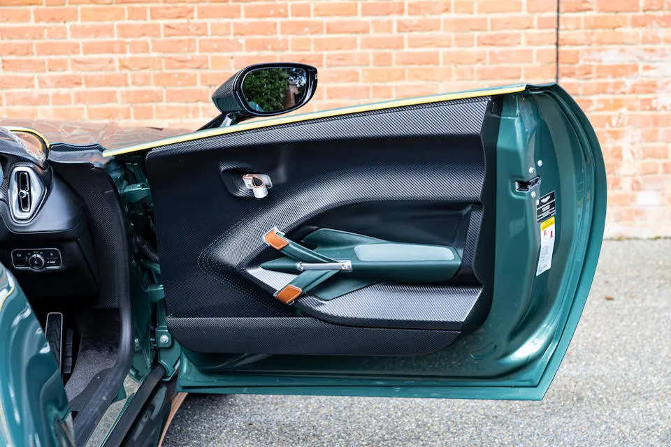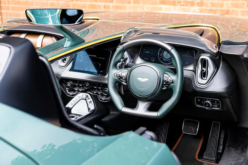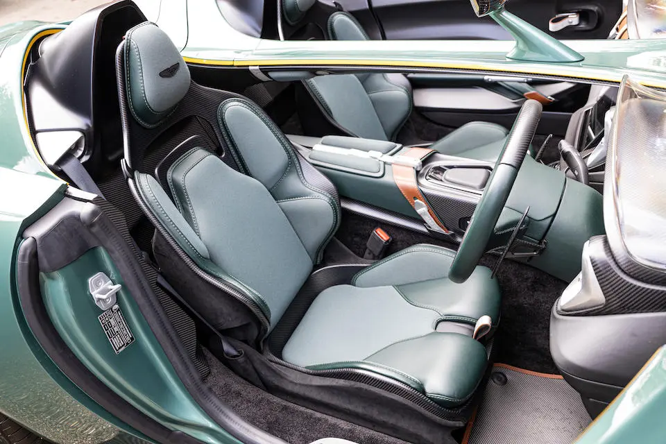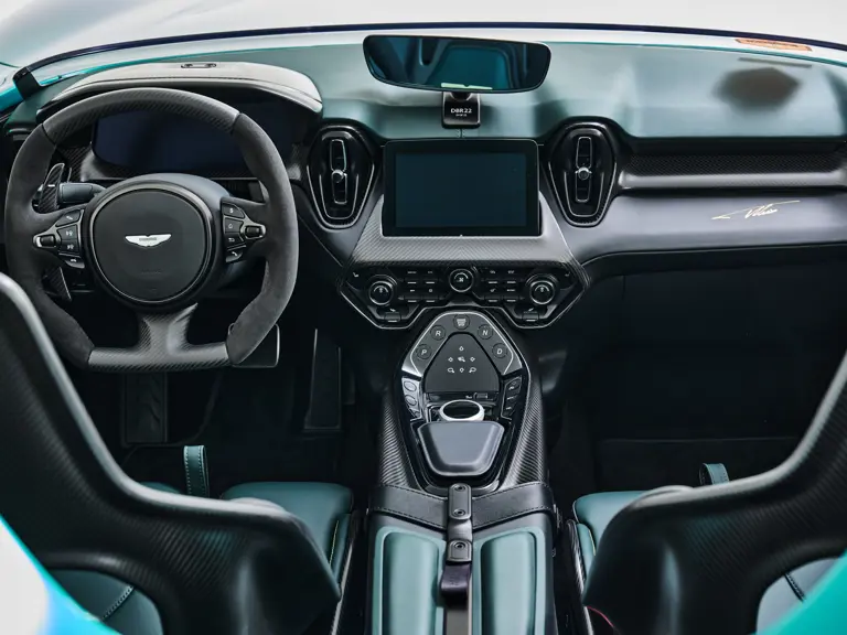 Garnitures intérieures en tweed dans le style de la DBR1 et fibre de carbone avec possibilité de personnalisation via le Département Q de la firme.