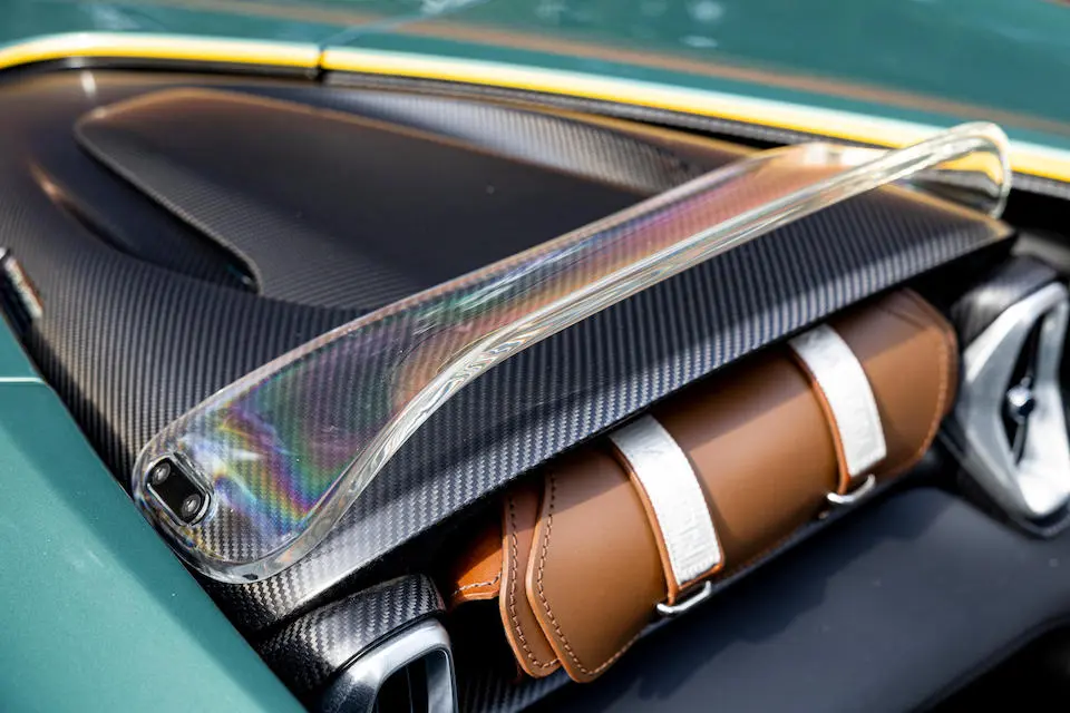 Coupé 2 portes, 2 places à carrosserie en carbone à porte-à-faux réduits et arrière reprenant les principes de Kamm. La Valour repose sur la structure de la DBS inchangée à partir des montants de pare-brise, le panneau arrière formé en aluminium reçoit 12 lames d’éclairage led et surmonte le diffuseur en carbone.