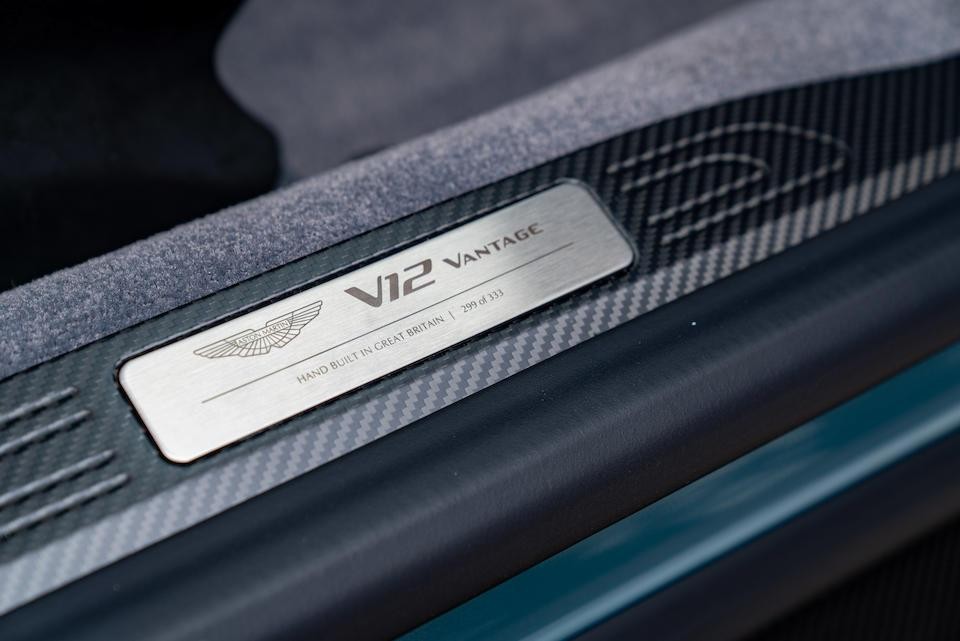 SCFSMGAV4PGN07339 : 2023, V12 Vantage, 1/333, pas d’aileron, feux arrières verre fumé, inserts carbone noir, étriers jaunes; coques de baquet carbone, Satin Xenon Grey, cuir et alcantara Onyx Black.