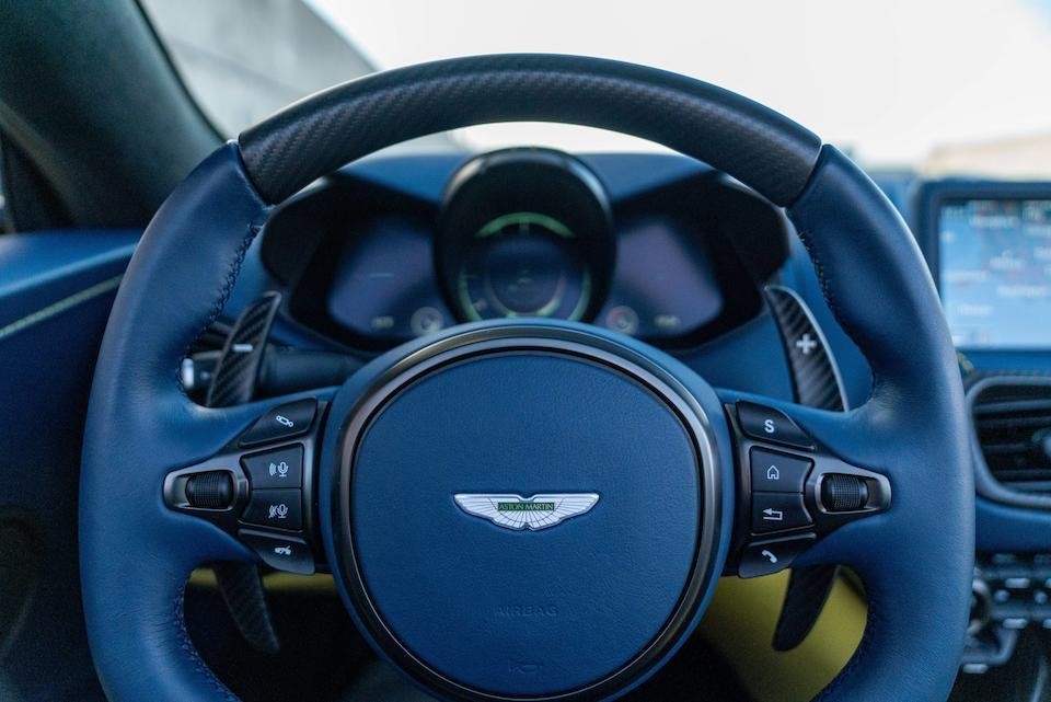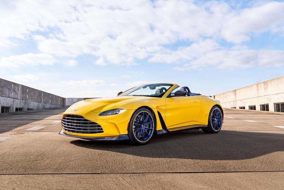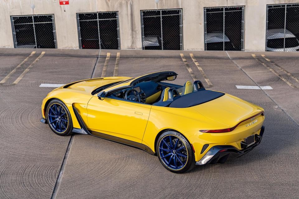 SCFSMGBV5PGP08407 : 2023, V12 Vantage Roadster, moteur AE31/62494, jantes bleues, garnitures intérieures Semi Aniline/Electron Yellow, Forest Glass Yellow, inserts bleu foncé, cuir Aurora Blue.