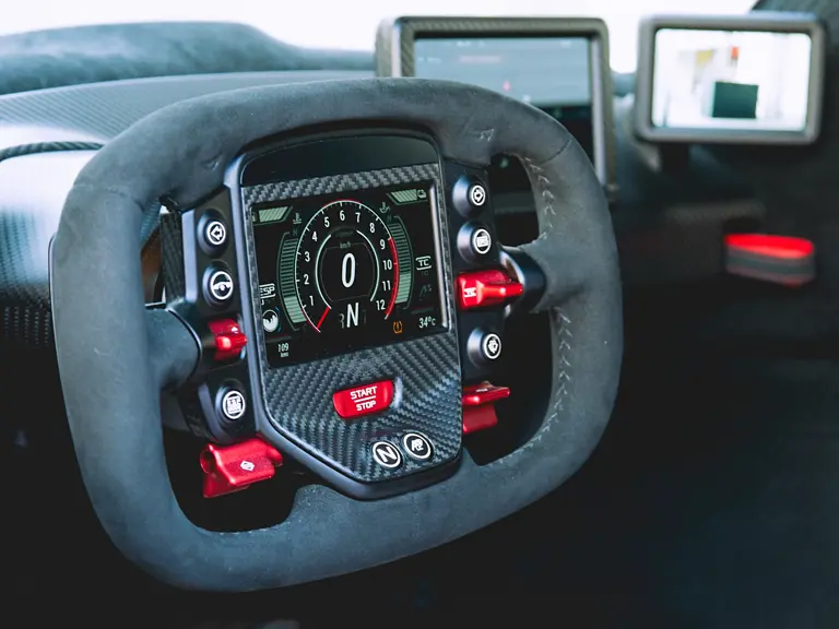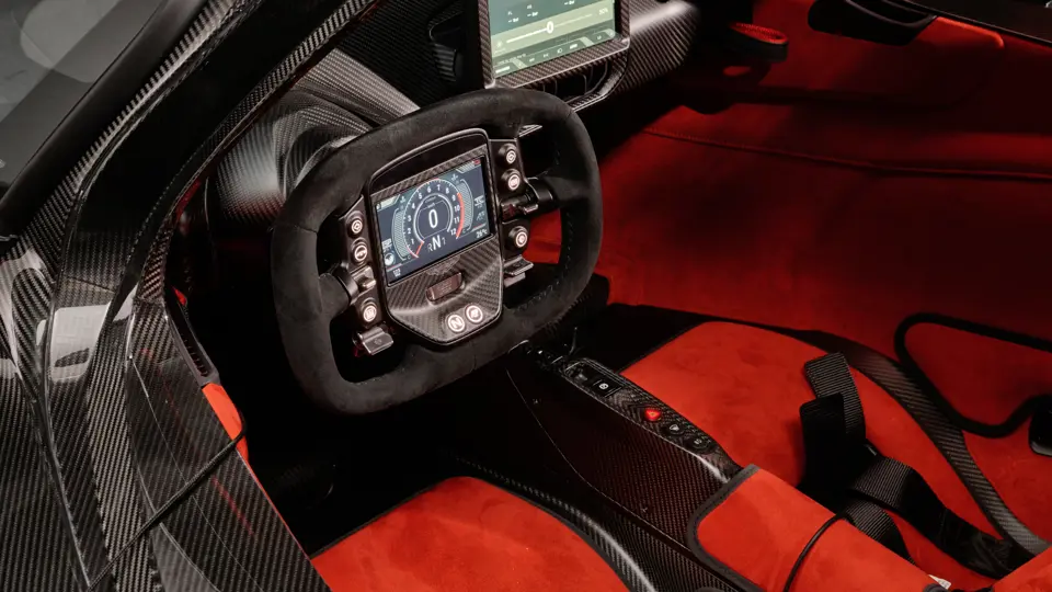 SCFKRB44NGS70090 : 19/10/2022 : Valkyrie Coupé, jantes magnésium Satin Black, étriers rouges, échappements inconel à embouts noirs, harnais 6 points rouges, , Lunar White, toit et partie arrière carbone, inserts rouges, alcantara Pure Black Deboss à passepoils rouges.
