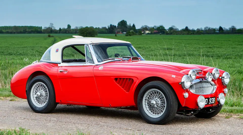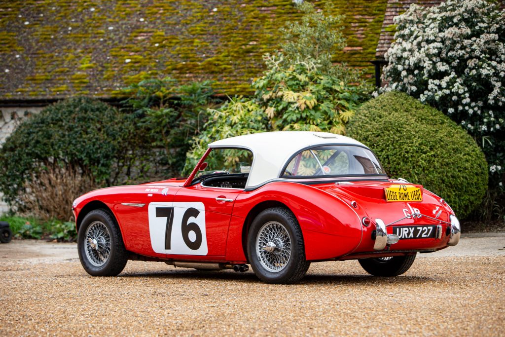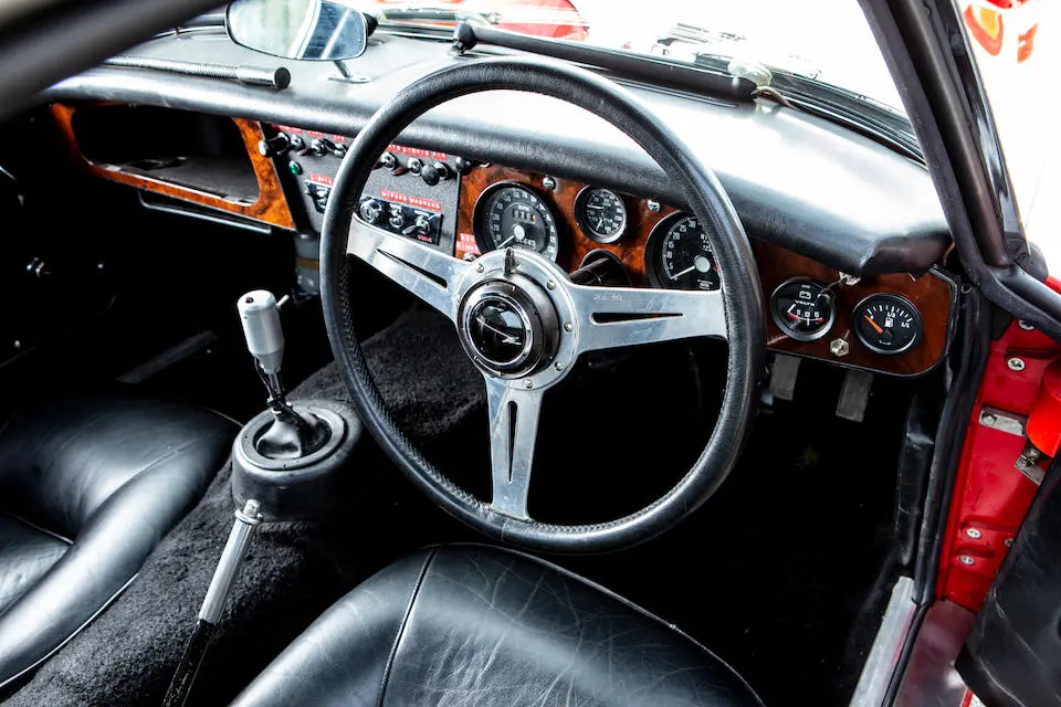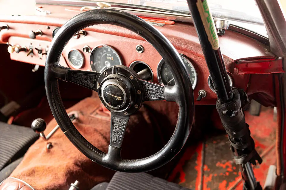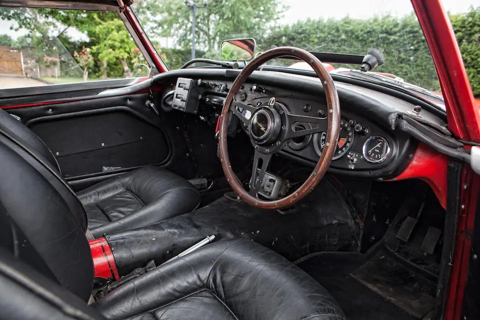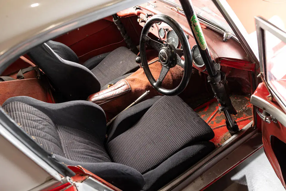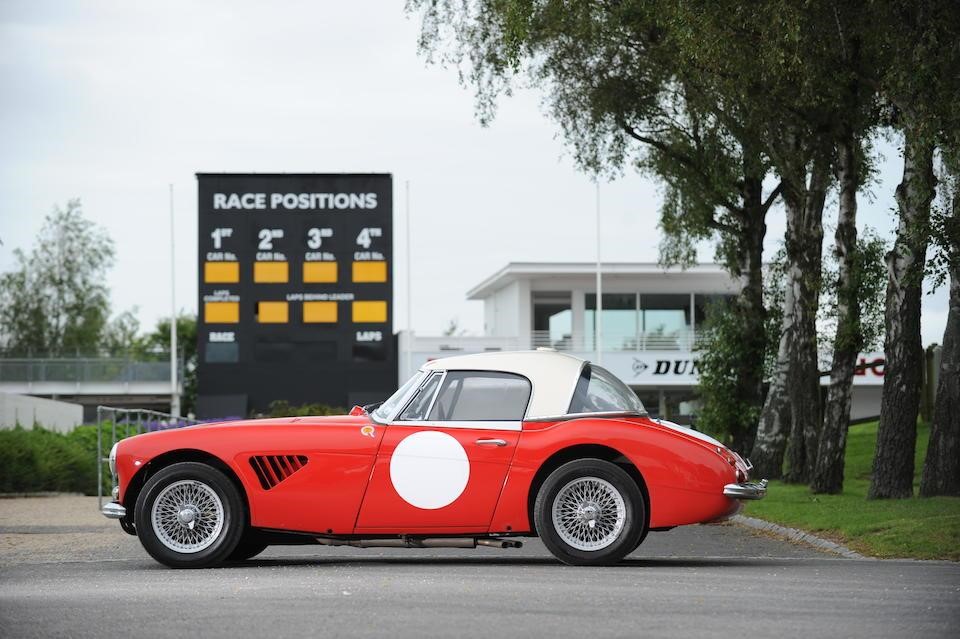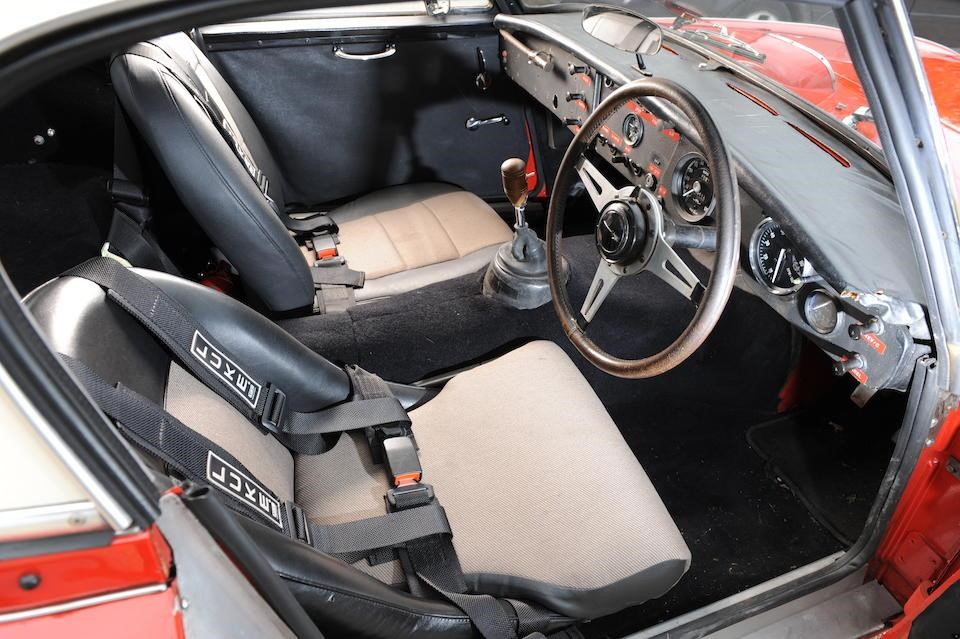 HBJ8/27573 : 1964, 3000 MK III, moteur AEC 1457RS20877, carrosserie aluminium, hardtop en fibre de verre, ouïes sur les ailes et le hardtop, nouveau dessin du coffre pour loger 2 roues de secours, culasse aluminium, 2 carburateurs Weber triple corps DCOE 13, conduits d’admission en alliage de magnésium, échappement compétition, boîte de vitesses compétition avec pignons Tulip, overdrive modifié, circuit électrique compétition avec fusibles séparés, disques avant et arrière avec double circuit maître-cylindre coaxial et servo, châssis renforcé au niveau des ancrages de suspension, sièges baquet, tableau de bord et volant compétition, gros réservoir avec 2 pompes à essence. Rouge, hardtop blanc.