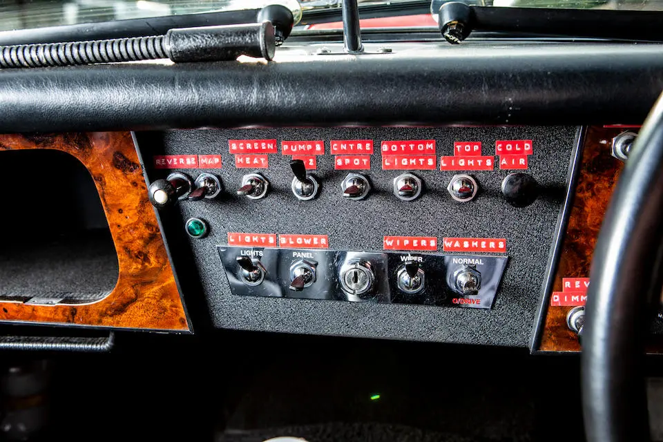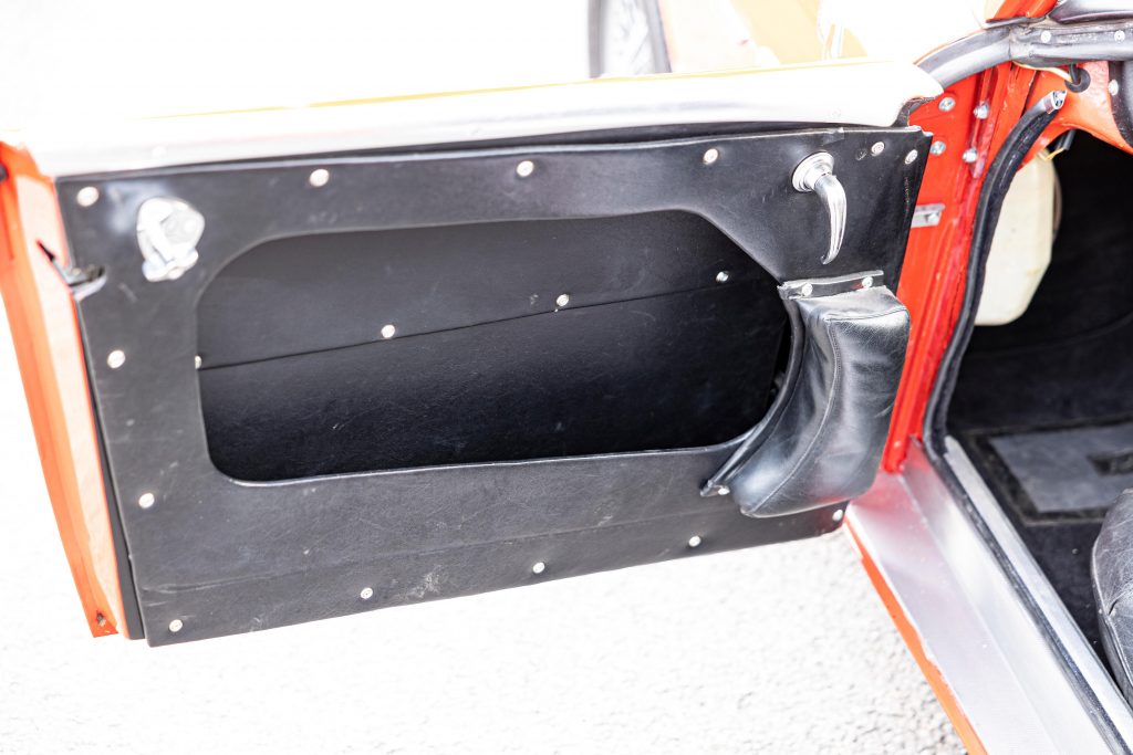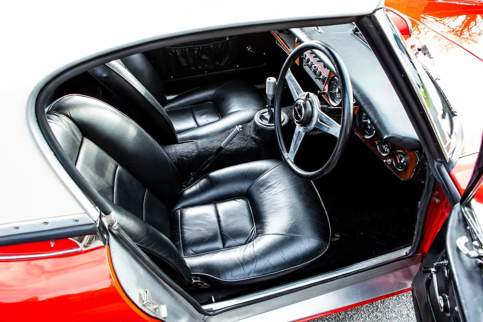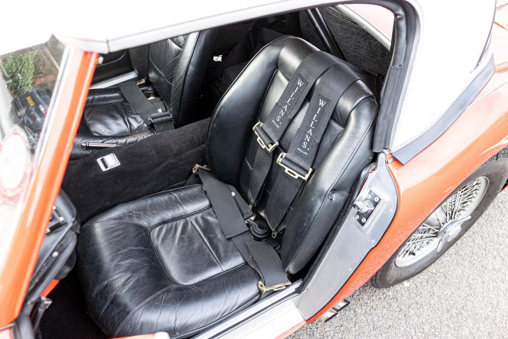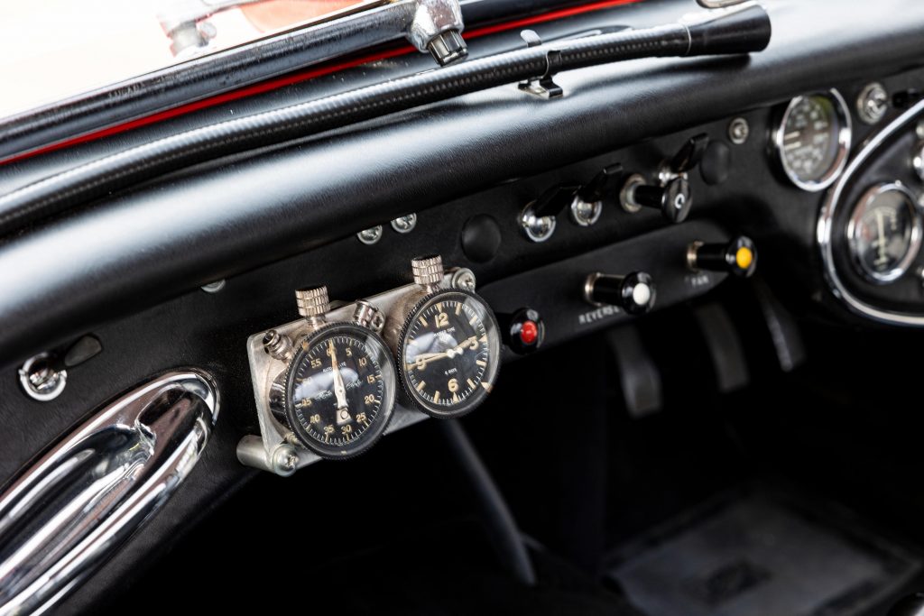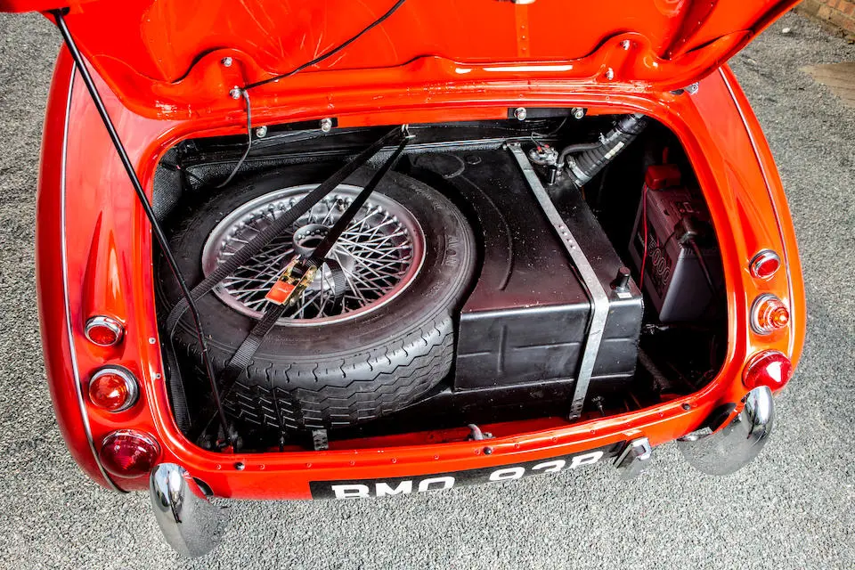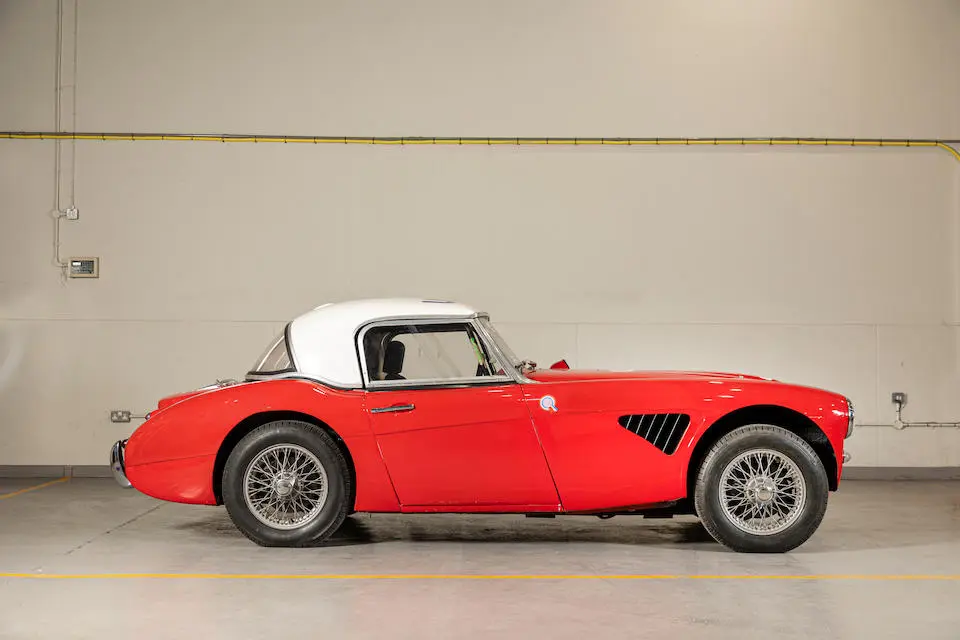 HBJ8/27573 : 1964, 3000 MK III, moteur AEC 1457RS20877, carrosserie aluminium, hardtop en fibre de verre, ouïes sur les ailes et le hardtop, nouveau dessin du coffre pour loger 2 roues de secours, culasse aluminium, 2 carburateurs Weber triple corps DCOE 13, conduits d’admission en alliage de magnésium, échappement compétition, boîte de vitesses compétition avec pignons Tulip, overdrive modifié, circuit électrique compétition avec fusibles séparés, disques avant et arrière avec double circuit maître-cylindre coaxial et servo, châssis renforcé au niveau des ancrages de suspension, sièges baquet, tableau de bord et volant compétition, gros réservoir avec 2 pompes à essence. Rouge, hardtop blanc.