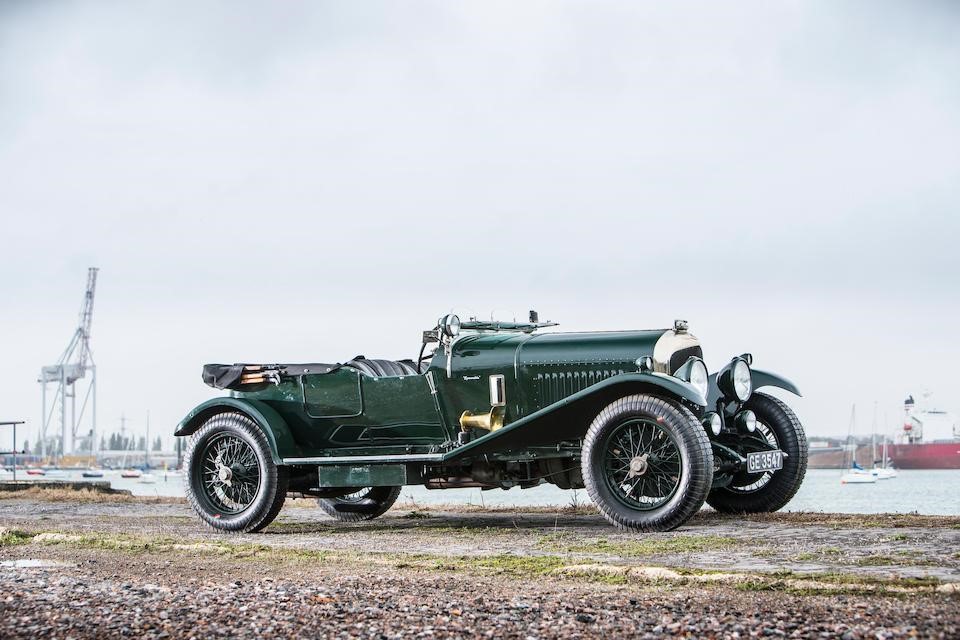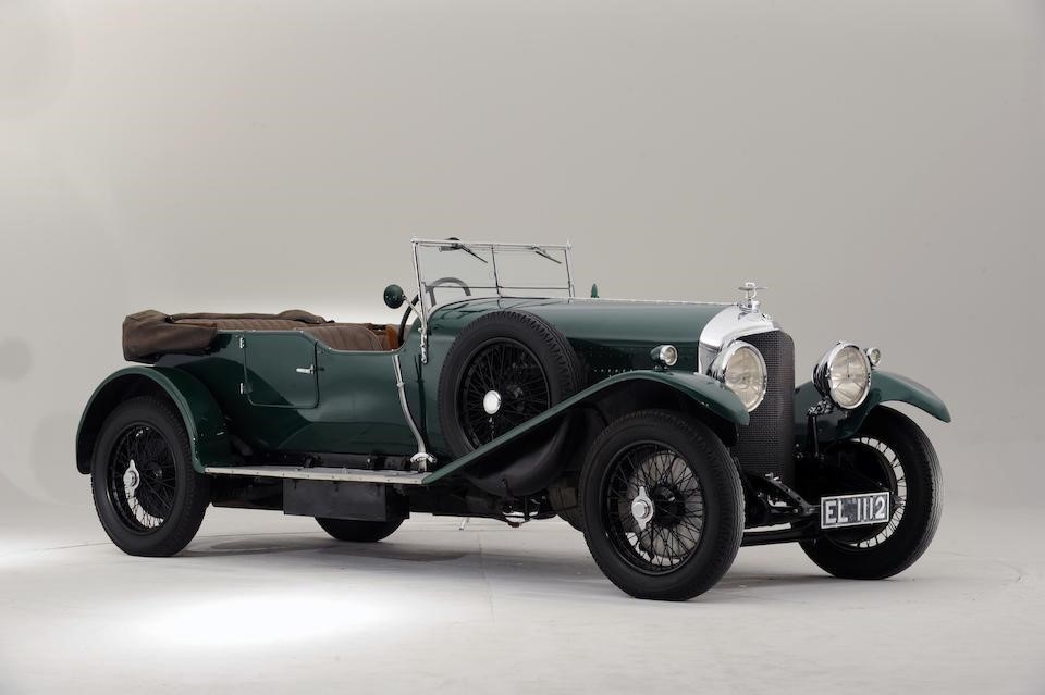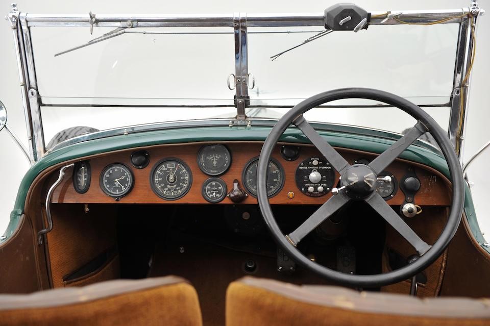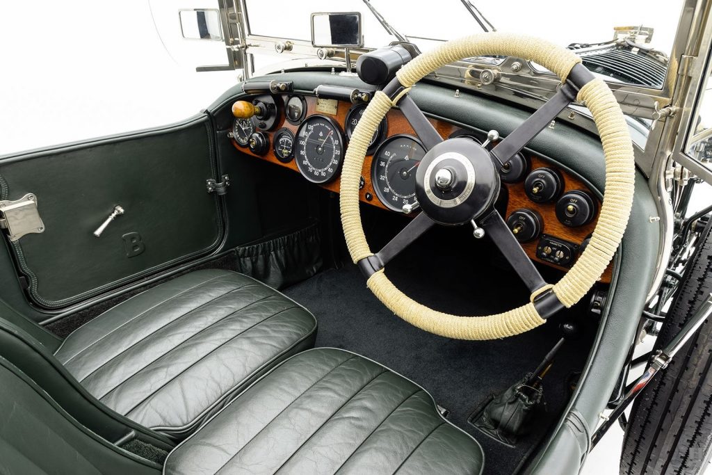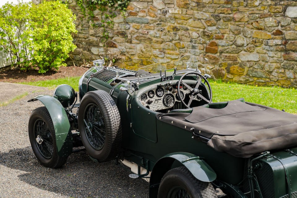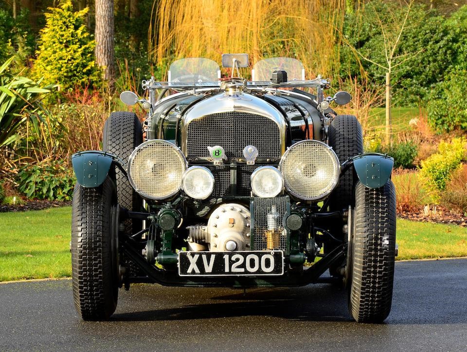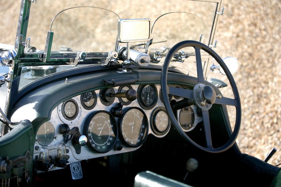 MS 3941 : 1931, 4 ½ l compresseur, Tourer 4 places 2 portes par Vanden Plas, 1/3 châssis aux spécifications Le Mans, taux de compression 5,1 :1, boîte de vitesses Type D, rapport de pont 13/46, échappement avec silencieux Pullswell, réservoir essence 25 gallons, compte-tours, 2 amortisseurs hydrauliques supplémentaires Bentley & Draper sur le pont arrière, pare-brise fixe en une partie, roue de secours latérale côté conducteur, barre supplémentaire à l’avant recevant un 3e phare central, tableau de bord avec 2 lumières d’éclairage supplémentaires et une montre Jaeger, gris clair, cuir gris.