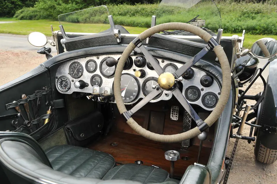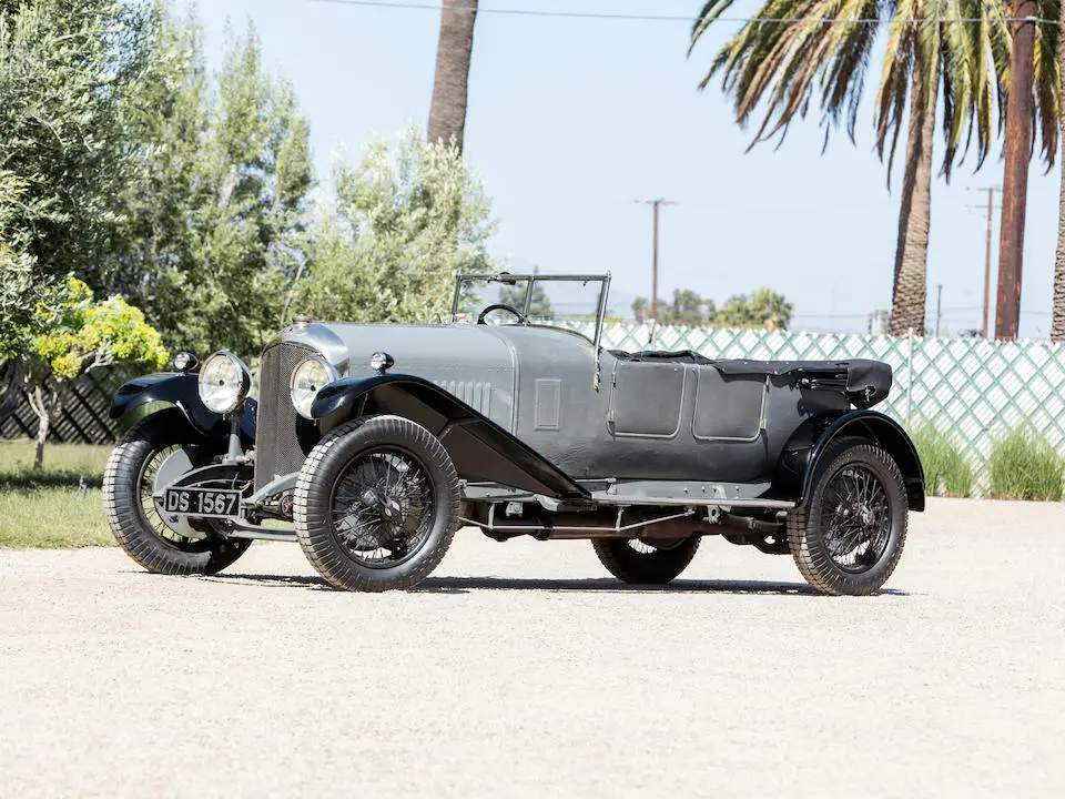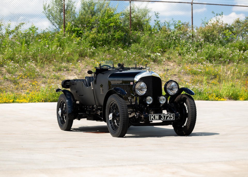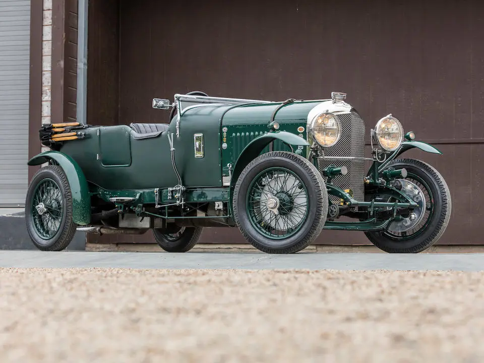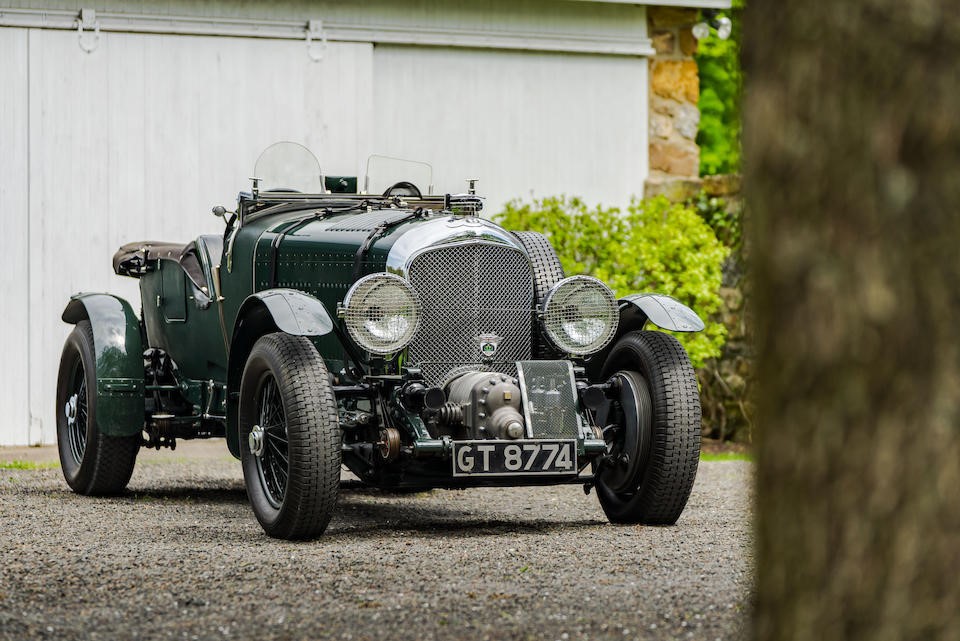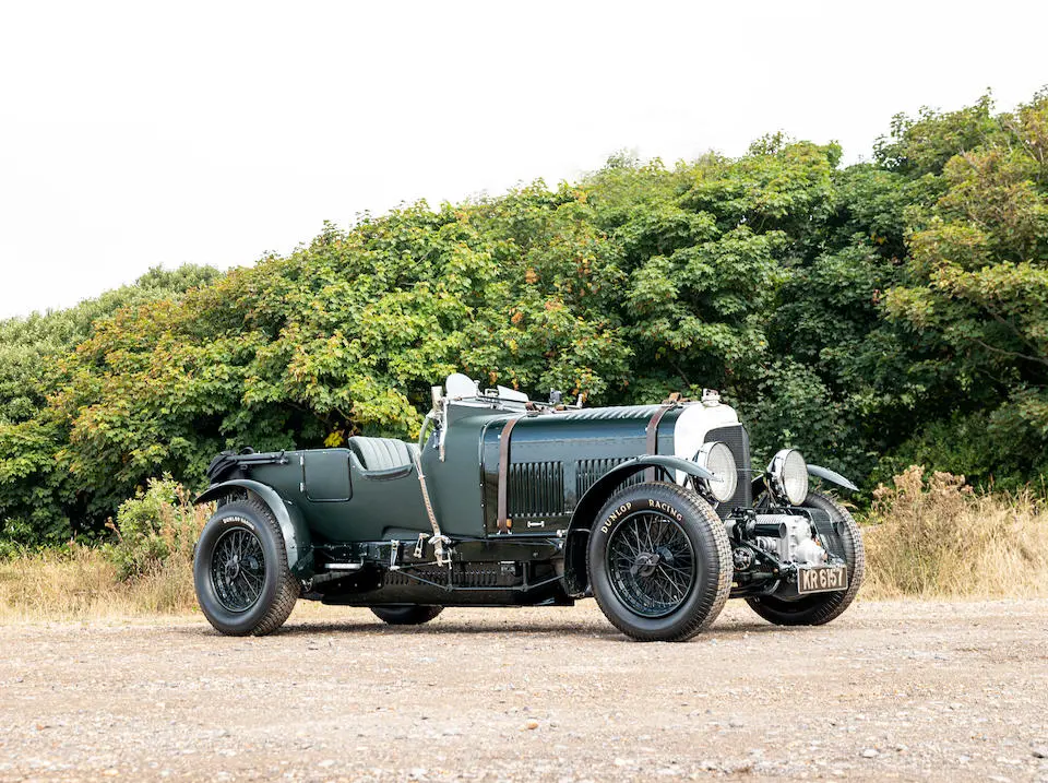 MS 3941 : 1931, 4 ½ l compresseur, Tourer 4 places 2 portes par Vanden Plas, 1/3 châssis aux spécifications Le Mans, taux de compression 5,1 :1, boîte de vitesses Type D, rapport de pont 13/46, échappement avec silencieux Pullswell, réservoir essence 25 gallons, compte-tours, 2 amortisseurs hydrauliques supplémentaires Bentley & Draper sur le pont arrière, pare-brise fixe en une partie, roue de secours latérale côté conducteur, barre supplémentaire à l’avant recevant un 3e phare central, tableau de bord avec 2 lumières d’éclairage supplémentaires et une montre Jaeger, gris clair, cuir gris.